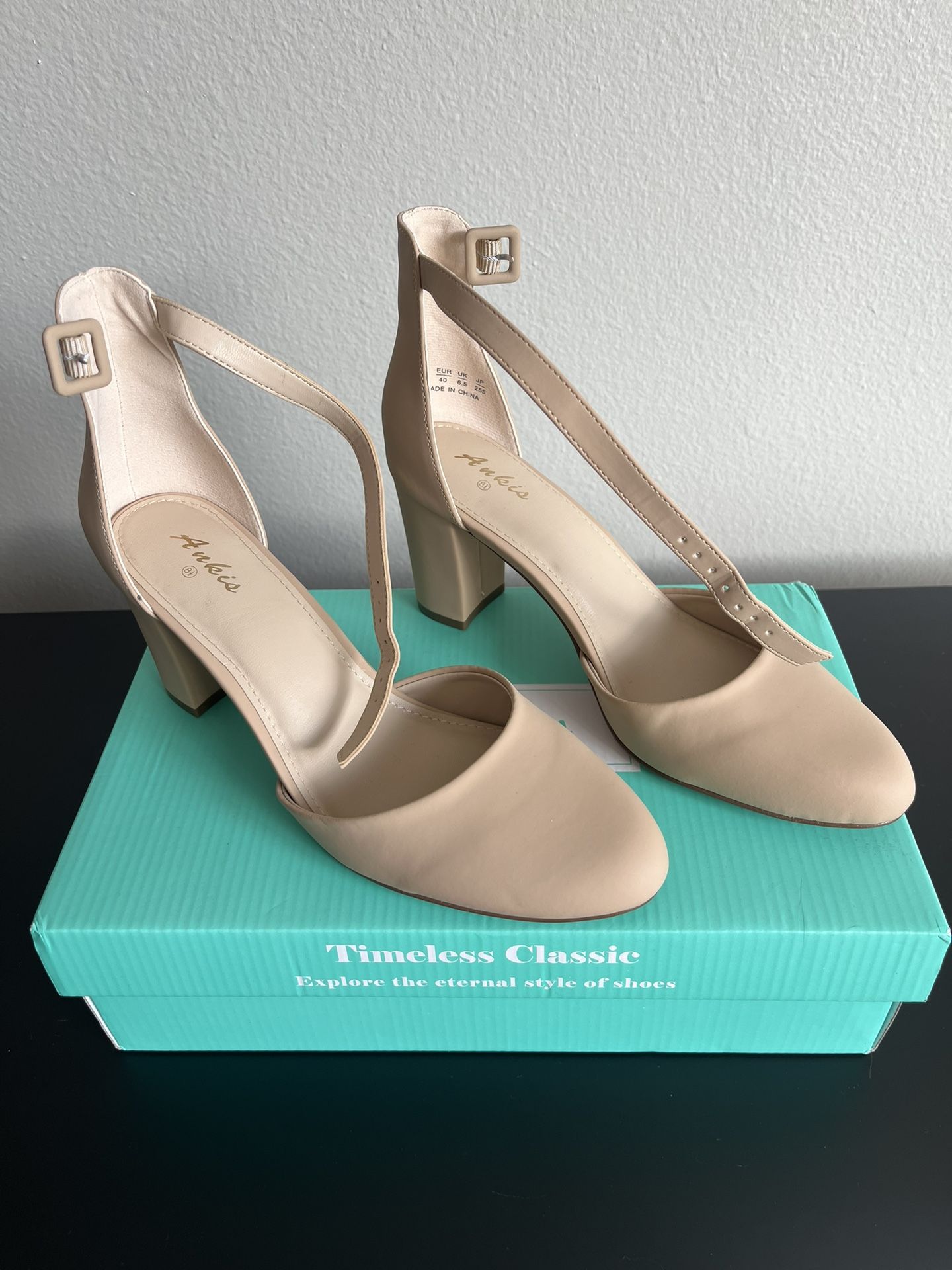 Never worn nude block heels in perfect condition. Classic, elegant style with ankle strap and comfortable block heel. Neutral color that goes with everything—great for work, weddings, events, or nights out. Comes with original box.
