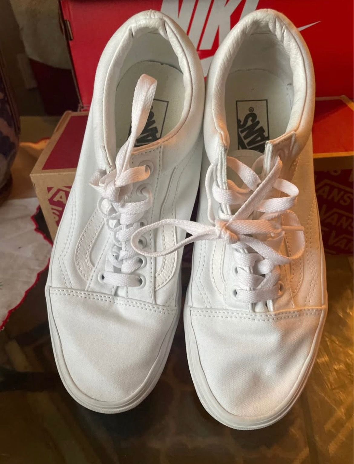 NO TRADES. Price is firm. Serious inquiries only. Located : northwest Willowbrook area Women’s all white vans Good condition size 9 in women 7.5 men