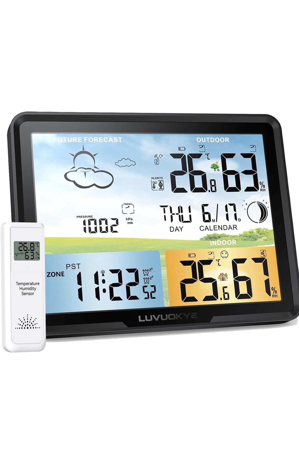 Weather Station Wireless Indoor Outdoor Thermometer, Digital Thermometer with Remote Sensor, Full Color Large Display Weather Station with Atomic Cloc