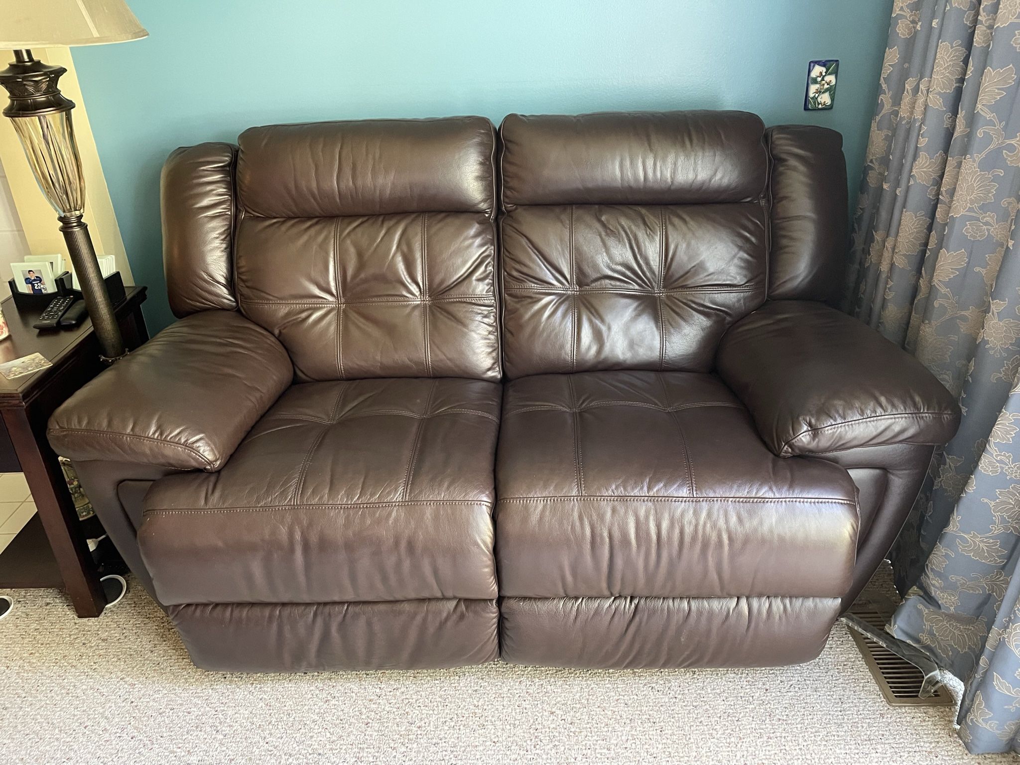 A gently used leather love chair. Both sides fully recline (manually). Six years old, leather is in great condition. Originally $1200.