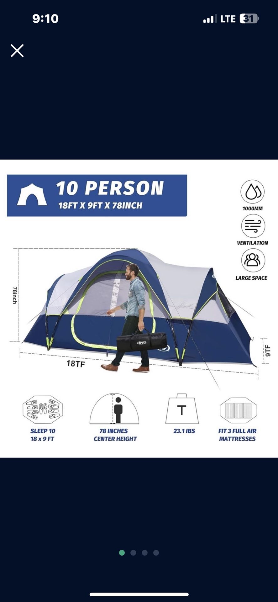 Spacious for 10 Person: Unique 18 ft x 9 ft x78 in, well fitting 10 sleeping bags or 3 queen air mattress, ideal for family camping. Easy-up Tent: There are no particular skills needed. Two people can set it up in 10 minutes. A bigger carry bag size of 25.6 x10.2 x 10.2 inches will let you feel relaxed and easily repack the tent. Good Ventilation, Large View: Top Large Mesh Roof makes it possible to watch stars with a wide view at night, three sides of big mesh windows, and the other two on each door boost air ventilation. 2 Room Tents: Hang one Privacy Divider Curtain from the ceiling, the tent becomes a room cabinet tent with 2 doors, which improves privacy. With a projector, the tent can also become an outdoor cinema by projecting videos on the divider screen. Quality Material: Polyester 185T PU1000mm fabric waterproof. Vestibular awning and extended awning design in rainfly better prevent rain from dropping inside.