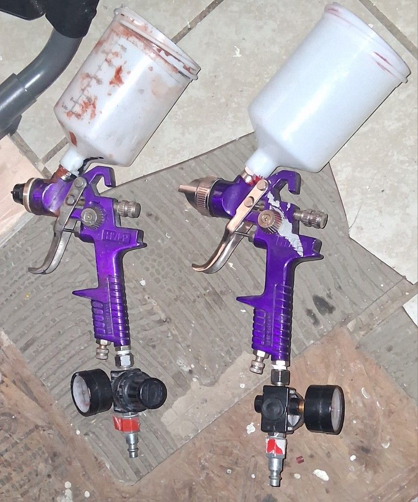 high-volume, low-pressure guns typically used for painting. They feature ergonomic knobs for precise control of paint flow and spray pattern. The guns generally have a 20 oz. capacity, though some models may have smaller 9 oz. or 3 oz. options. They are designed to use less paint and produce less overspray than traditional siphon-feed guns.