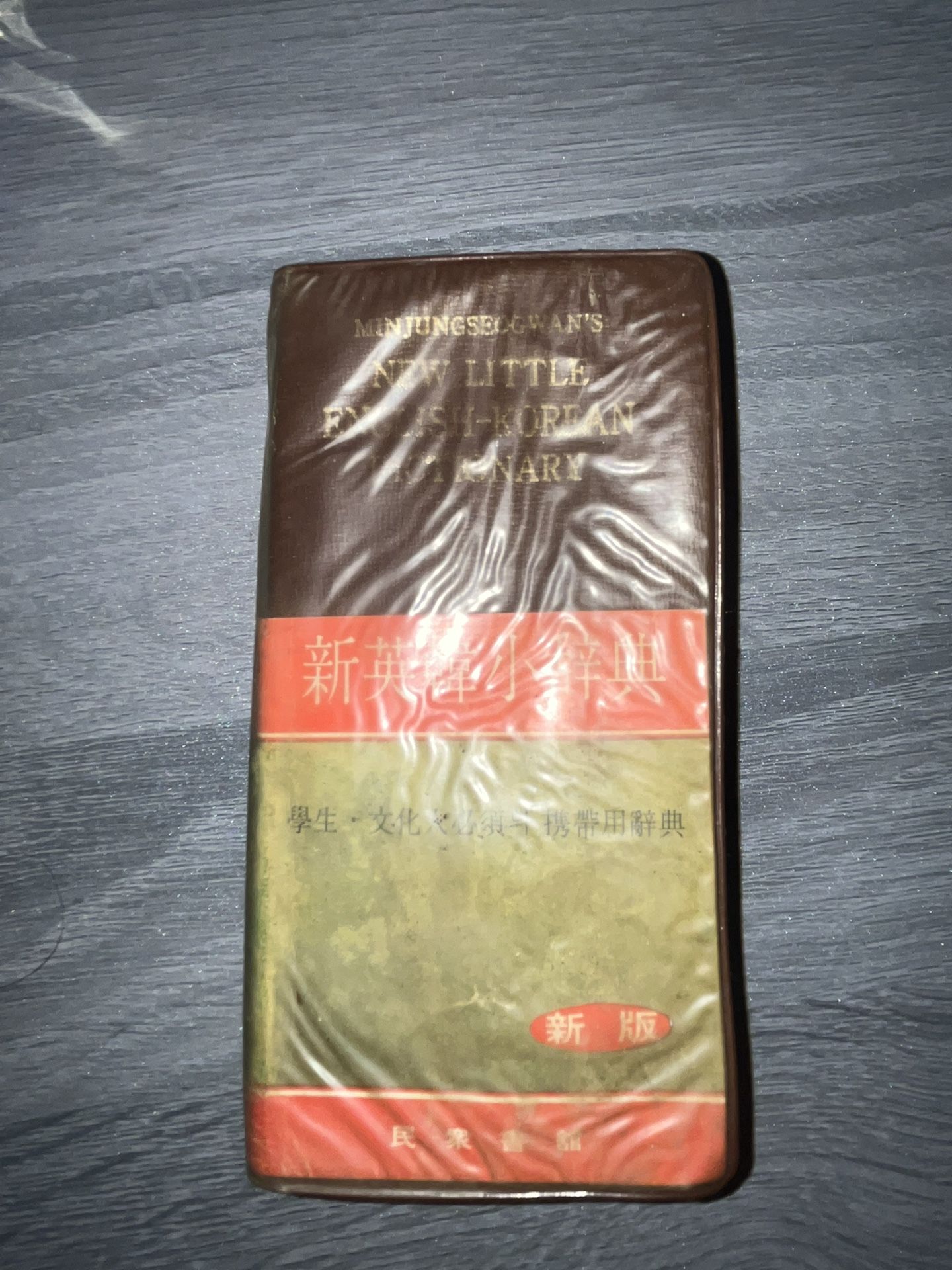 Vintage Minjungseogwan’s English-Korean mini dictionary. Still wrapped in original plastic with visible wear. Great for language learners or collectors of foreign language books.