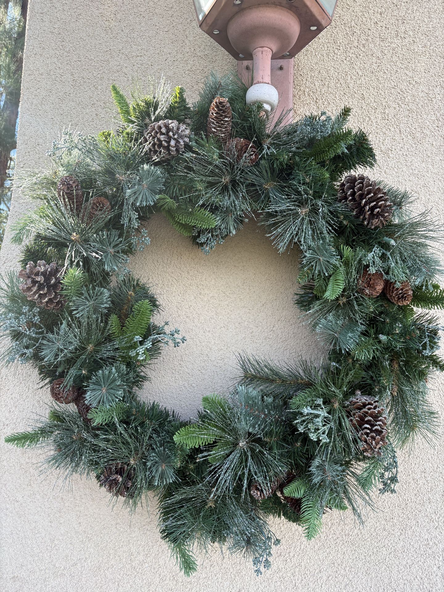 2 Beautiful Faux wreaths With Battery Operated Lights. They look beautiful in the morning and at night. Battery last all season with timer. These are big wreaths.