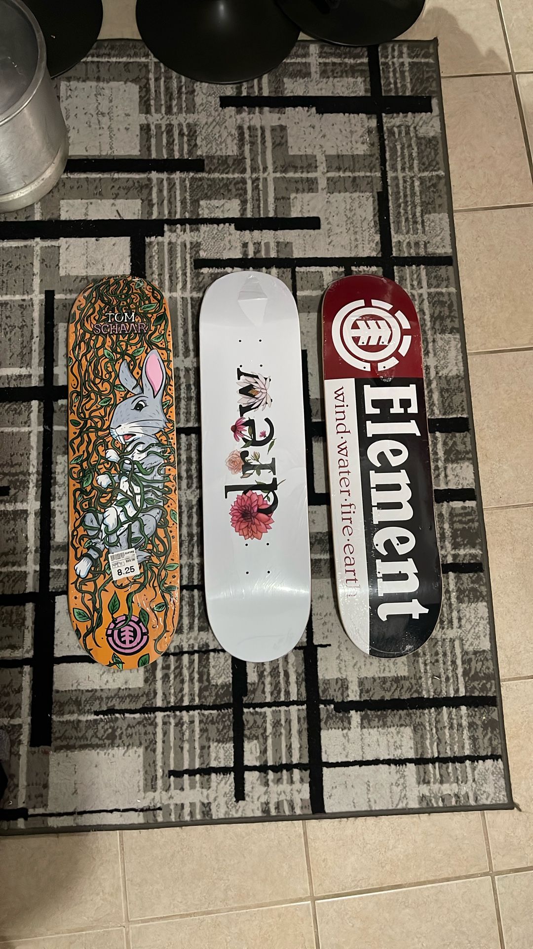 hi i’m sell my 3 Brand new skateboard decks in its plastics seal all decks are sizes 8.25 we have Tom Schaar Easter bunny pro deck for $ 50 and Original Element deck Red white and black for $35 and flower Drew all white deck for $ 30 take them all together for $100 bucks flat let me know if you have any questions !