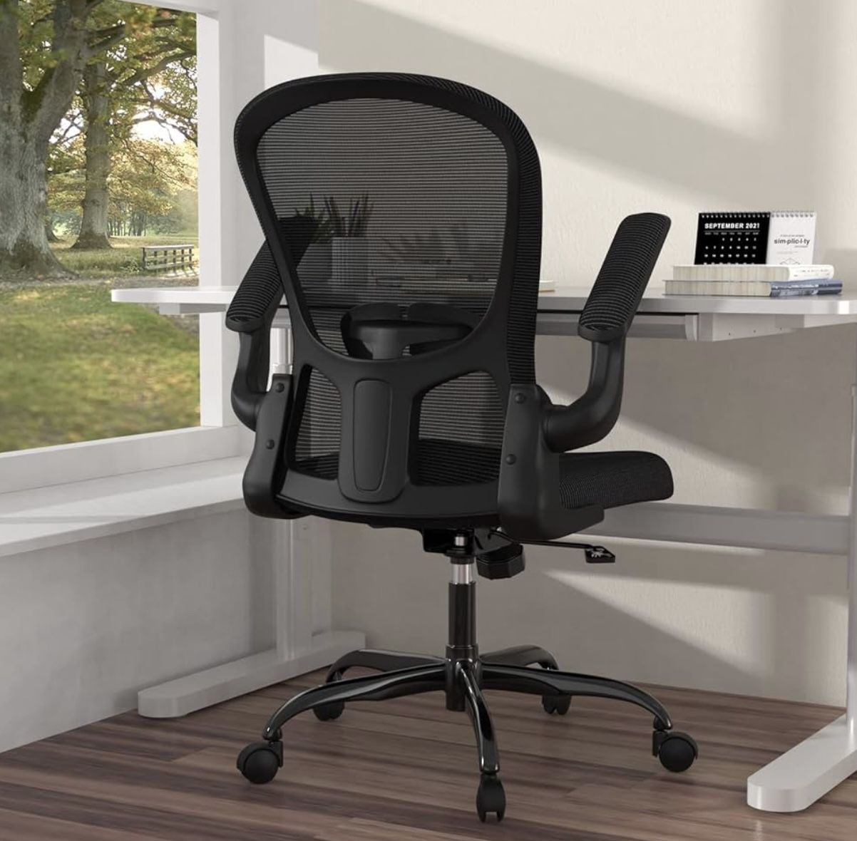 ERGONOMIC COMFORT SWIVEL BREATHABLE MESH, LUMBAR SUPPORT FLIP UP ARMS, ADJUSTABLE HEIGHT OFFICE CHAIR, BLACK, NEW