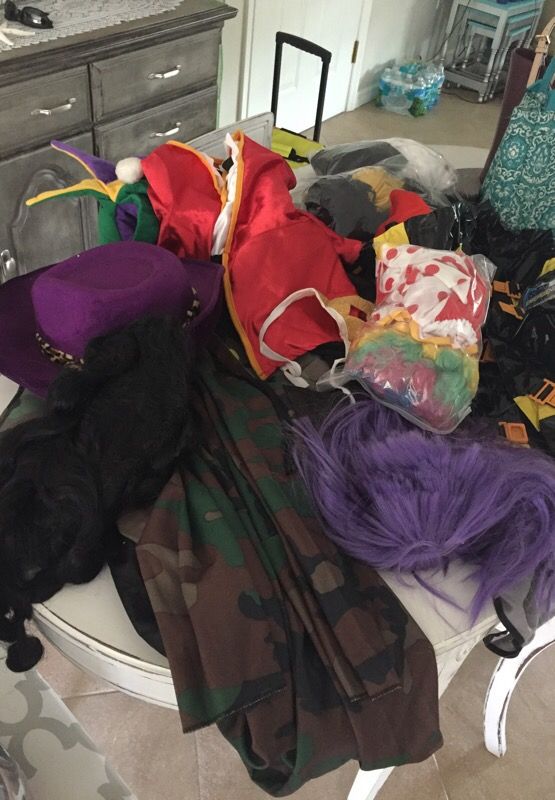 Odds and ends All different Halloween custumes and accessories Way to many to list them all For children all age groups Just to list a few: Military custome Firemans jacket Many hats Witches wigs Jester hat Policeman hat etc etc Selling entire kit as is Many of these outfits were worn once by my kids Great for Halloween or for dress up Sold as is and buyer takes it all