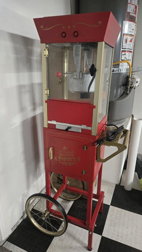 Works great. Used about 3 times. 53inch tall. Can be removed from the rolling cart and place on table top if needed. Includes many popcorn packages. The plug that goes into the kettle is a little lose but does not present any issues. It may need to have the plug head replaced but is working just fine. I have around 6+ large popcorn packages with cheddar and coconut butter if you would like to have for free. This is like a $40 value just for the popcorn packages. The Popcorn cart cost over $200. Great for parties and entertainment.
