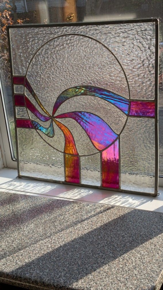 Stained Glass panel featuring obscure glass in the background......and RED glass image that has Iridization on the surface of one side....Zink outer frame has a ring at each corner for multiple options to hang piece for display Panel is 23in x23in and features copper foil construction This item is from my personal creative holdings and was created in 19 85