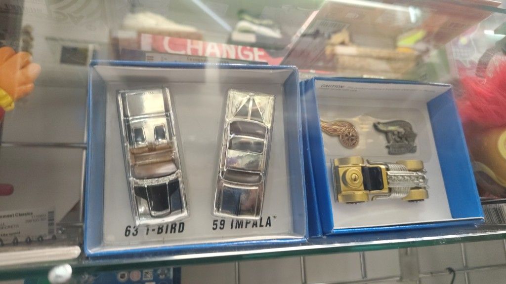 Hello here we have two chrome vintage KB toy lowriders one Thunderbird and another Impala come together as a set brand new Impeccable shape, great for any true collector