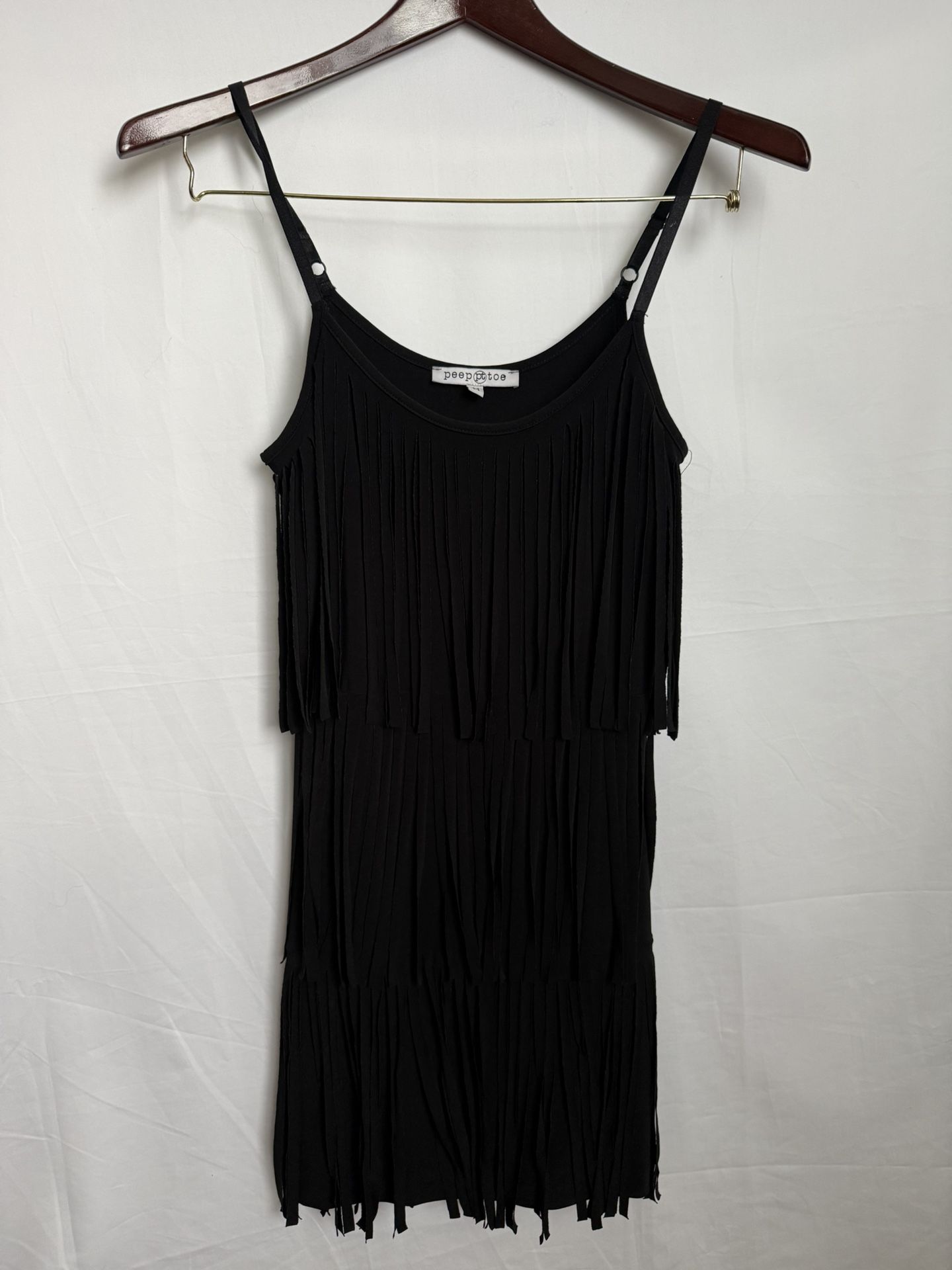 Stylish black fringe dress by Peeptoe, size Medium. This sleeveless dress features layered fringe detailing that creates beautiful movement and a flattering silhouette. Lightweight fabric, adjustable shoulder straps, and a classic black color make it perfect for evenings out, parties, cocktail events, or festivals. Easy to dress up with heels or keep casual with boots or sandals. Details: • Brand: Peeptoe • Size: M (Medium) • Color: Black • Style: Fringe / Layered / Sleeveless • Condition: Good pre-owned condition Great statement piece for any wardrobe.