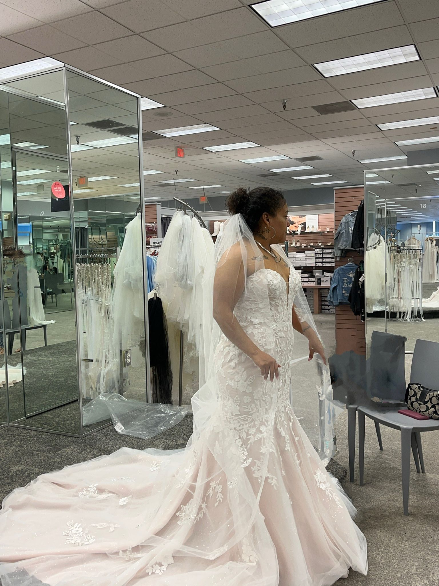 This breathtaking vintage-inspired wedding gown features a soft light-pink blush underlay that gives it a romantic, ethereal glow. The dress is designed in a flattering mermaid silhouette, beautifully sculpting the waist and hips before flowing into a stunning tulle chapel train. Delicate floral lace appliqués are placed throughout the bodice, sleeves, and skirt, adding a timeless elegance. The gown includes illusion long sleeves, a deep sweetheart neckline, and soft shimmering details that catch the light perfectly. Perfect for brides who want a blend of classic romance and modern glamour. The dress photographs beautifully in any setting and creates a truly unforgettable bridal look.