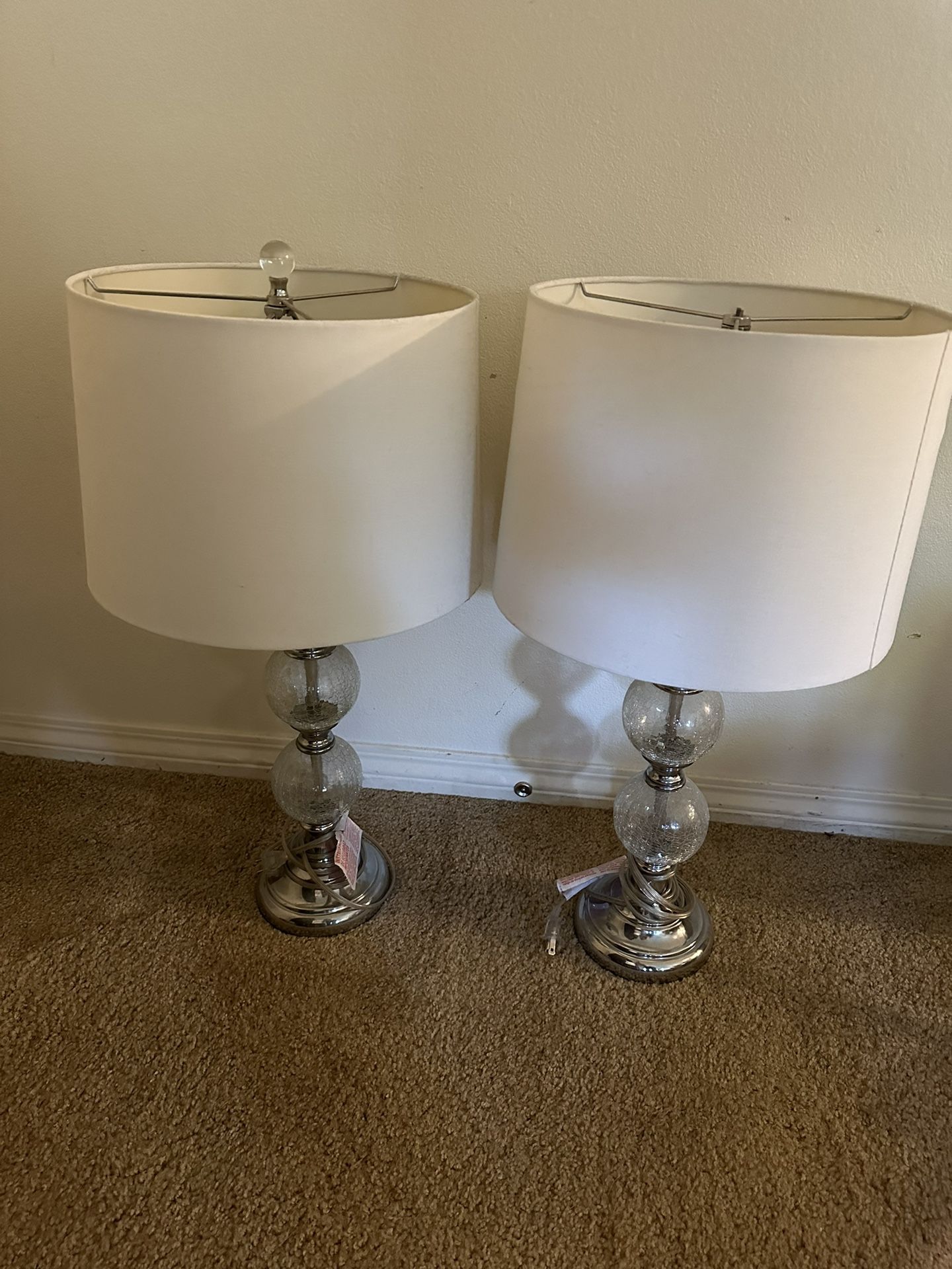 Missing one screw to hold on the lampshade! Has one light bulb. Beautiful base. Can purchase different lampshade to you’re choice.
