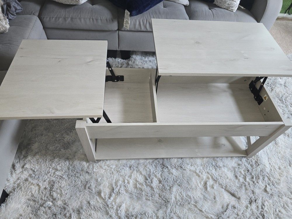 Coffee table that raises ($80), 58" tv with wall mount ($175), wood end table with two plus and USB ports ($40), fireplace console($200), couch($250), floor lamp ($40 & $50), gray bench ($75), metal abstract art ($50), beige in hard plastic wall art ($200)