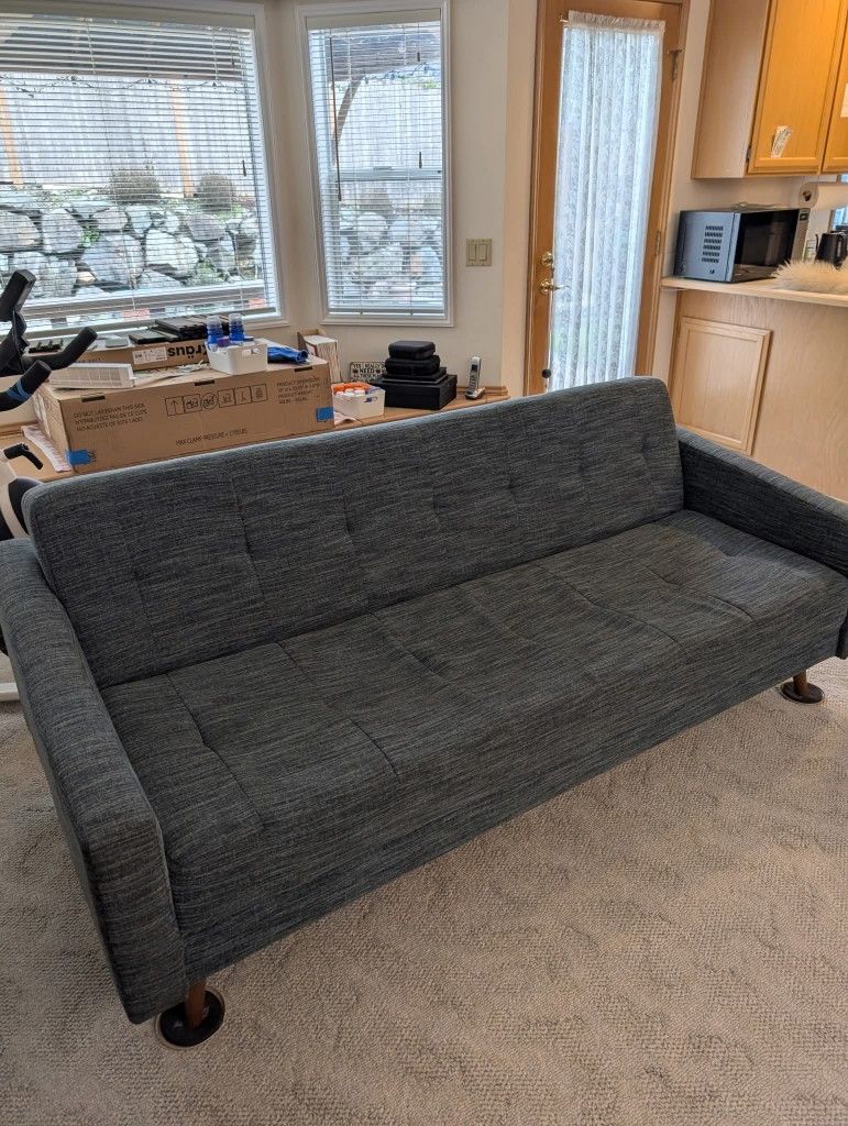 This futon is about 80 inches long on the bench. Really solid and looks great. Minor wear and no rips or tears anywhere. I recently got it and it just doesn't fit my space well like I hoped. Must have a way to haul it. Pick up only. Near Shorecrest High School, Google that for an ETA. $25 OBO Thanks for checking it out!