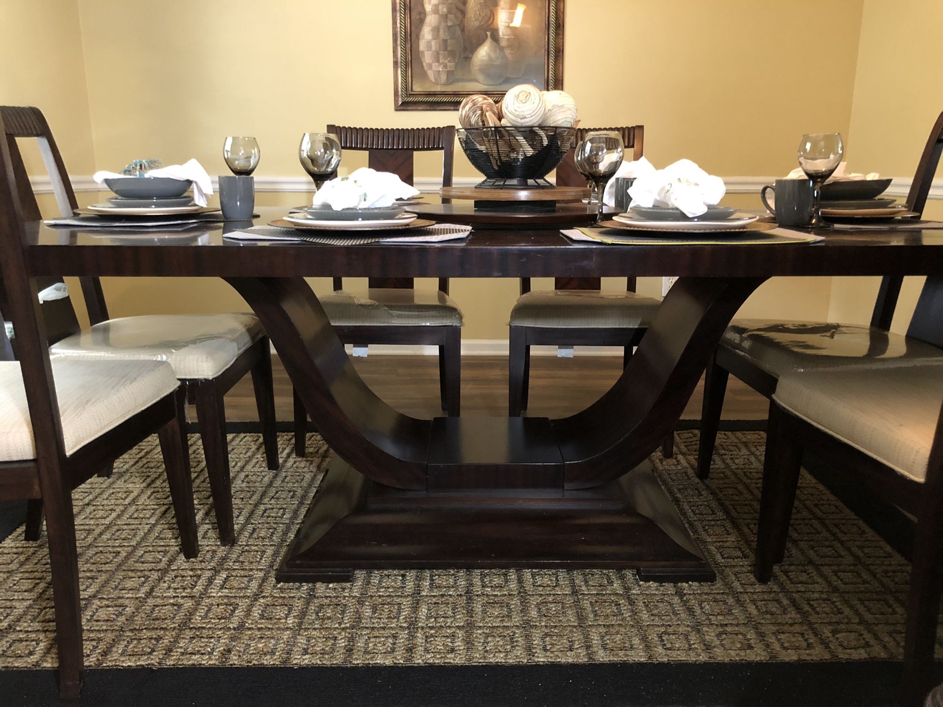 DINING TABLE W/T (6) CHAIRS, GLASS INSERT, & DECORATIVE BOTTOM. FOR SALE: $1300. NO SHIPPING! NO DELIVERY! CASH SALE AT PICKUP! SOLD AS IS. ALL SALES ARE FINAL!