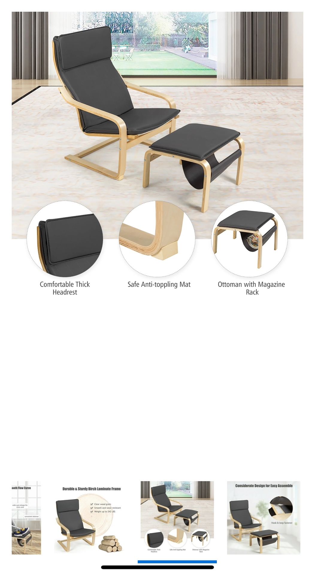 Costway Relax Lounge Chair & Padded Ottoman Set w/ Magazine Rack Gray