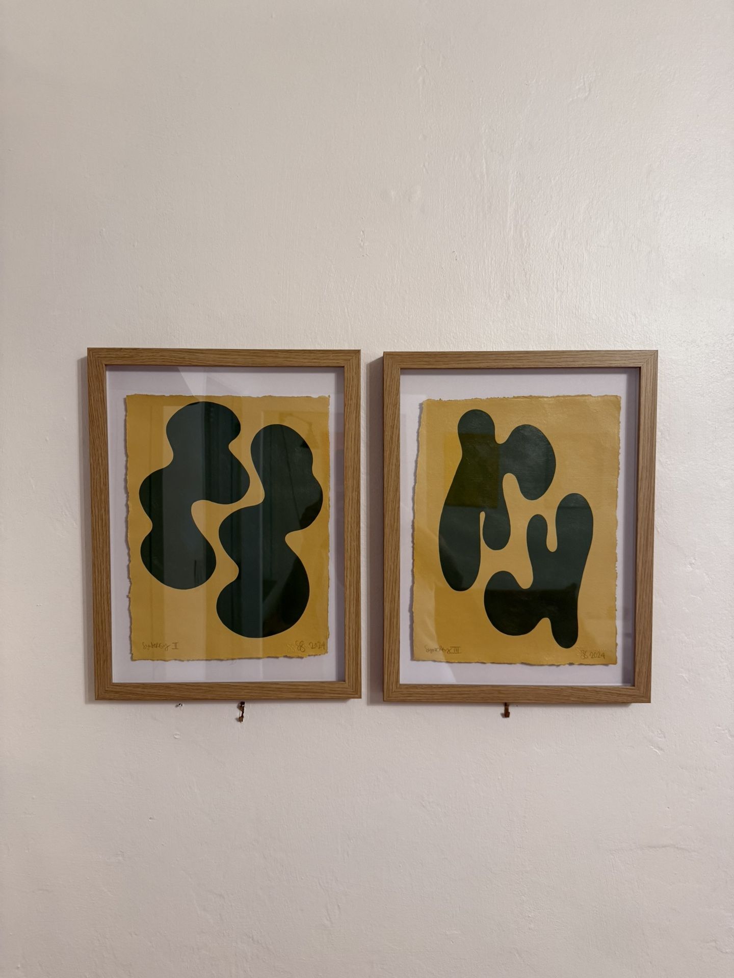 2 paintings on paper of nature shapes. Framed and matted with floating paper. Small / medium sized.