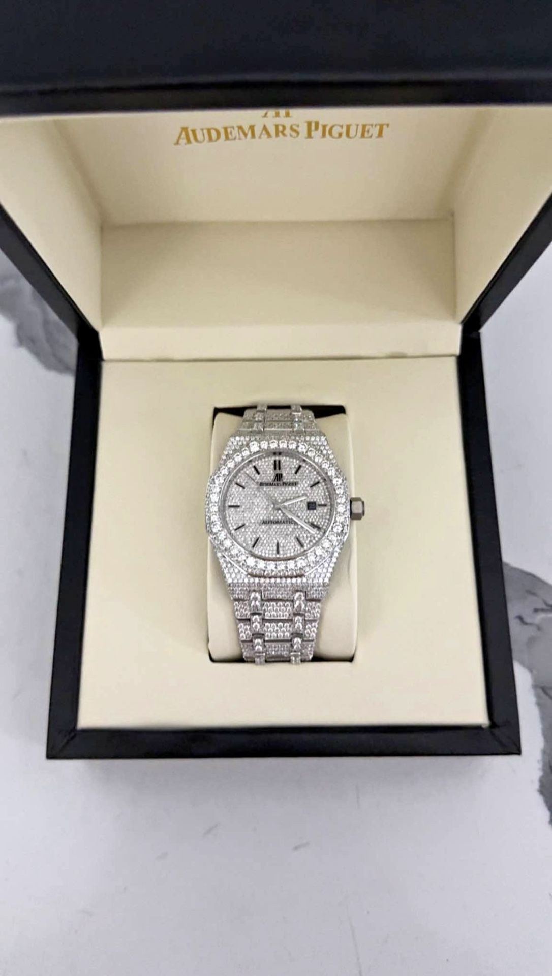 If you're looking for a watch that turns heads instantly, this is it. This fully iced-out Moissanite watch is top-tier quality - crafted for those who appreciate bold style and premium shine. The stones hit hard in any light and give you that high-end luxury look without the ridiculous retail price. # Features: High-grade Moissanite stones with incredible brilliance Fully iced face and band Heavy, solid feel - not lightweight or cheap Precision movement Brand new condition Secure clasp This isn't low-quality fashion jewelry. The shine, clarity, and finish speak for themselves. Perfect for special occasions, nights out, or if you just like standing out. Serious inquiries only.Message me if you want additional photos or a video of the watch under lighting. Available for local pickup.