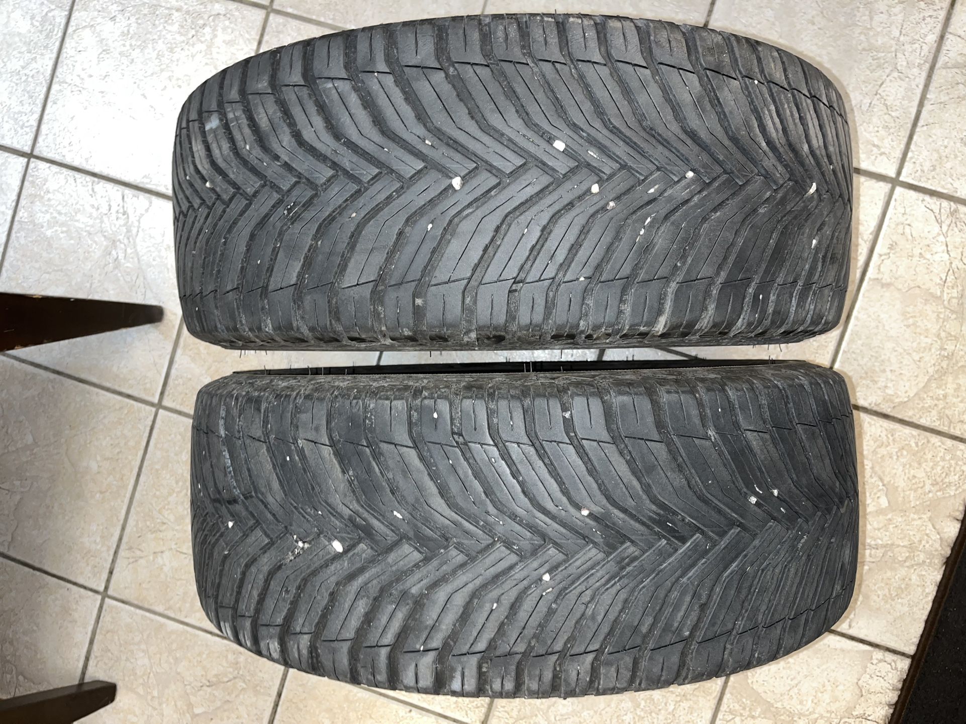 2 used 215/45R17 Michelin Cross Climate tires. These are 60K mile tires. I drove 35K on them. Just took these off and put new ones on today. Has a plug in 1 tire, the other has none. These are $228 each new at discount tire company. Top rated tires. Has a small cut shown in the last picture but has no issues holding air. Selling cheap to sell fast. I don’t want them taking up space in my apartment. Cash only. Pick up in River Grove. No Holds, first come, first serve.