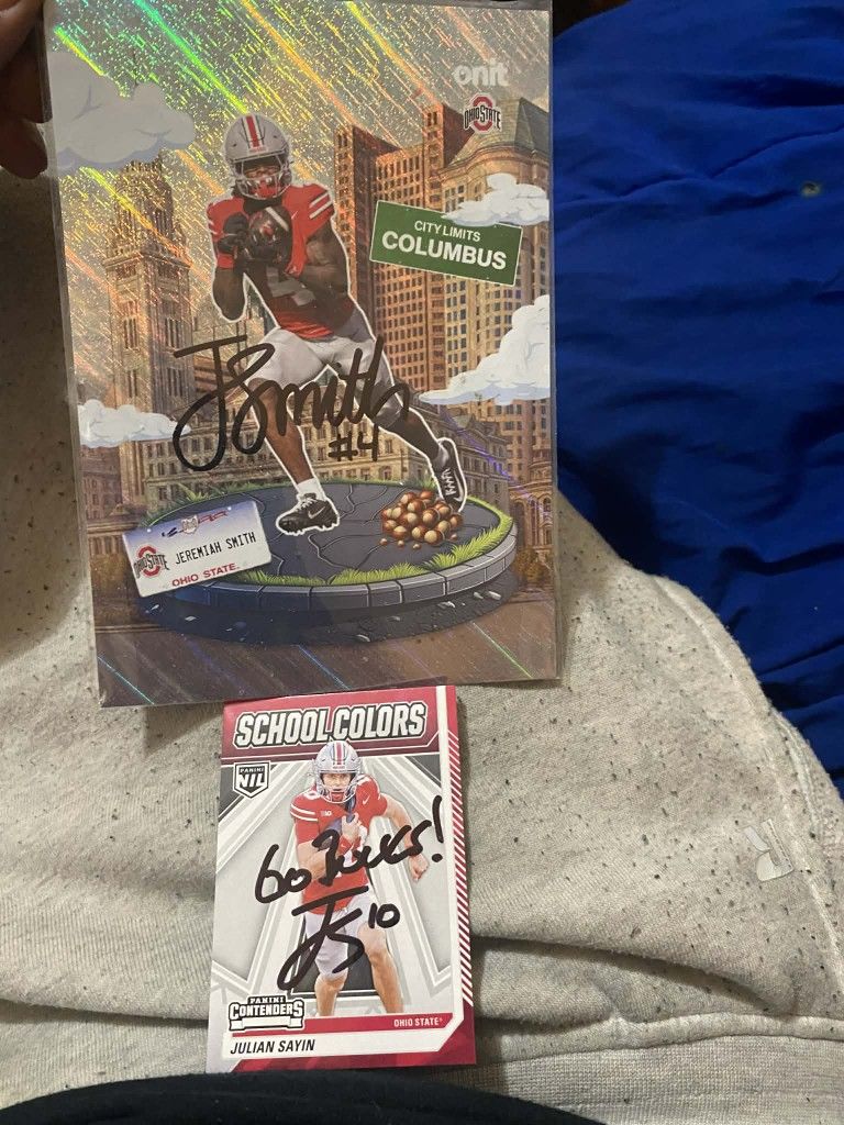 Autographed cards of Julian Sayin and Jeremiah Smith signed outside the Woody Hayes practice facility in Columbus Ohio open to offers