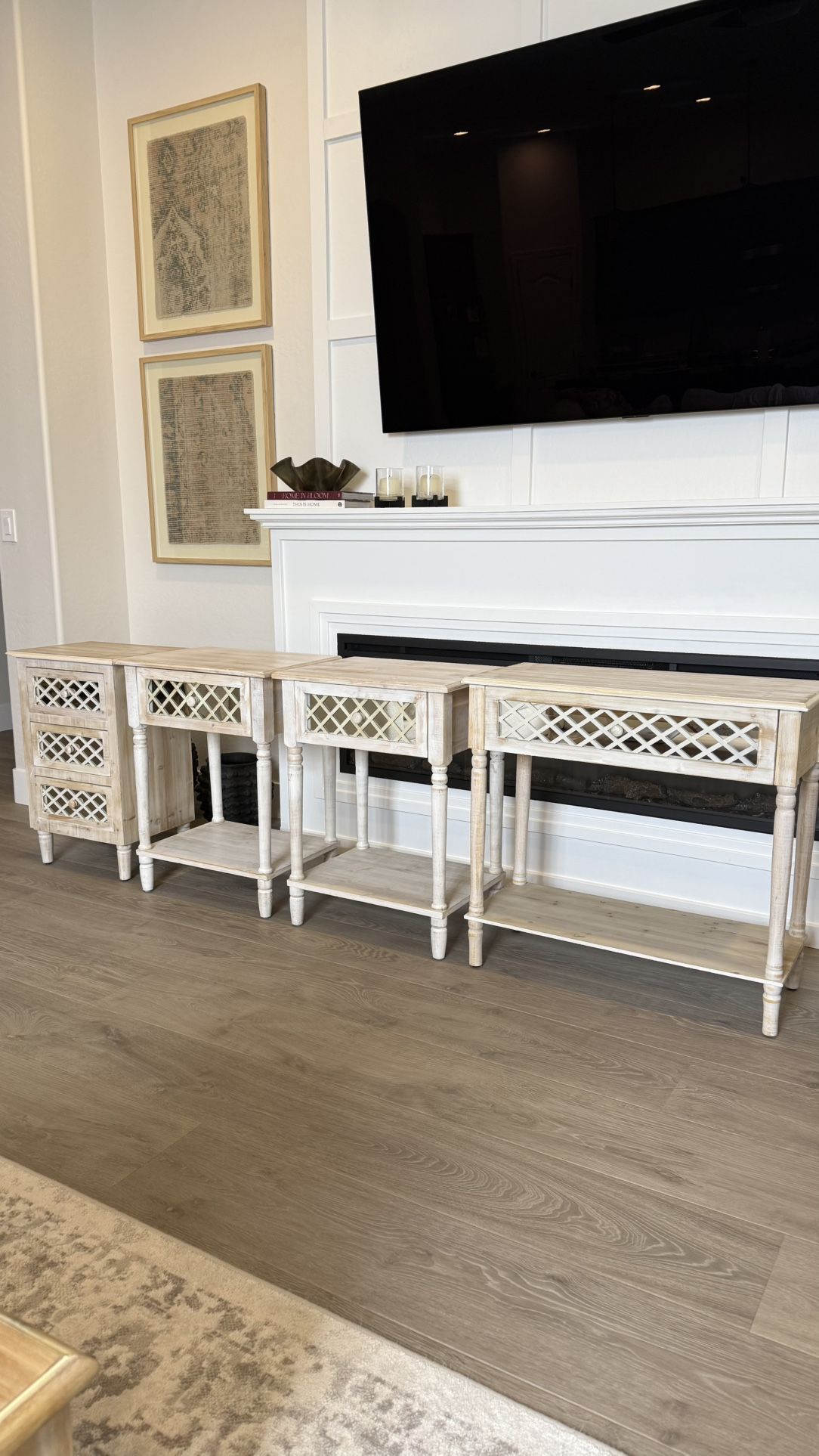 Set of 4 rustic farmhouse-style pieces with a distressed whitewashed finish. (1) console table (2) side tables/nightstands (1) 3-drawer storage nightstand Each piece features detailed lattice drawer fronts with mirror detail and turned legs. The side tables and console tables have a lower shelf for extra storage. Perfect for adding charm and function to a living room, entryway, or bedroom. Selling as a set. Please note that each piece has slight variation for that distressed weathered look. Please note that the 3-drawer piece has a chip. **Picture attached to show this chip. Console table: 31 3/8”wide 13 3/4” deep 29 3/4” height Side tables/nightstands: 21 1/2” wide 15 5/8” deep 28 7/8” height 3 drawer storage nightstand: 18 1/2” wide 13 7/8” deep 28 5/8” height