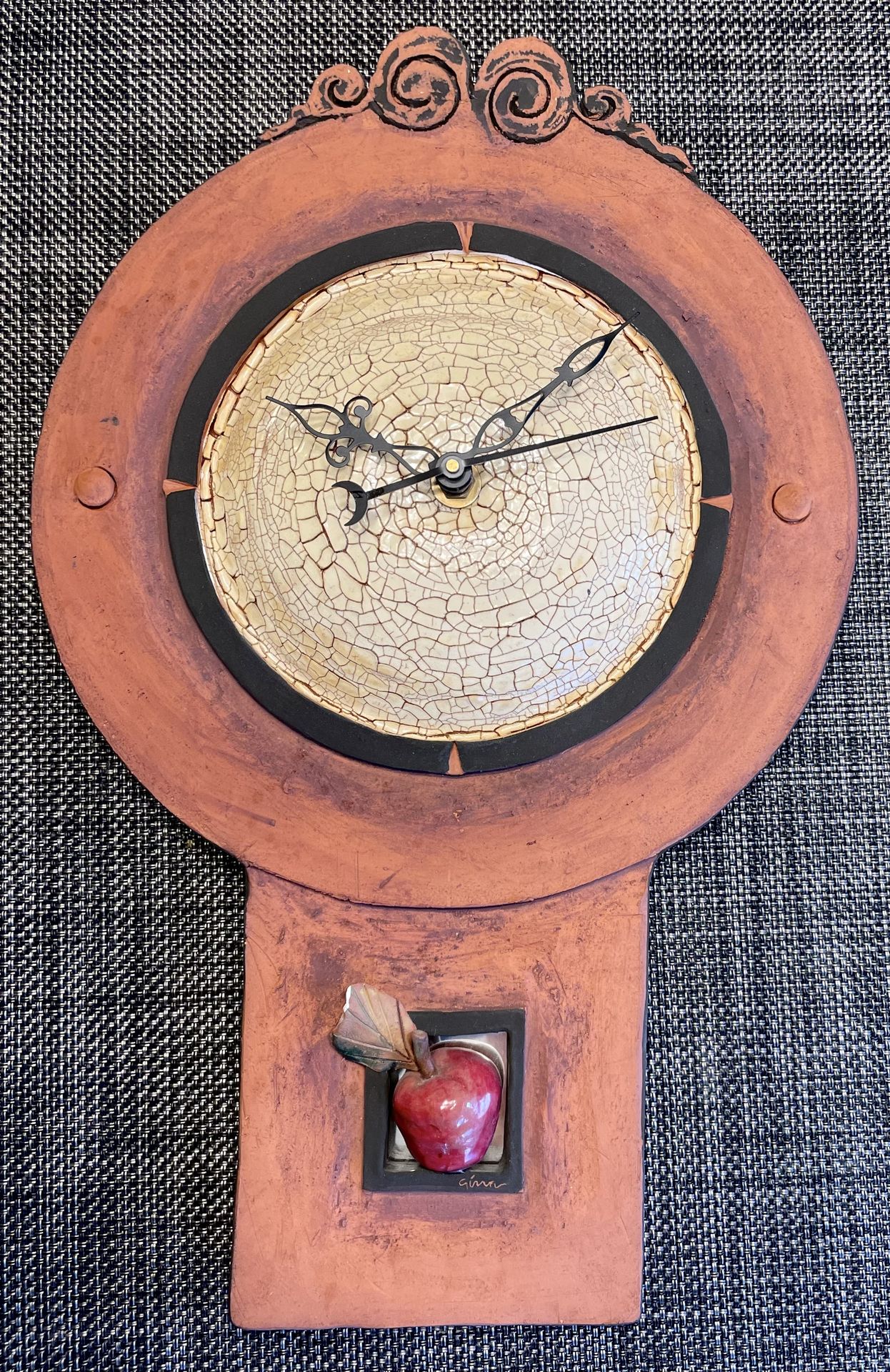Beautiful Hand crafted wall clock by Clayworks. Clock measures 15 1/2 inches high by 10 1/2 inches at the widest part. Purchased at a pottery show, loved it hanging in the kitchen, but no longer have space for. Note the very tip of the apple leaf is broken, but can easily be hidden with a little color. Selling clock for $20.00