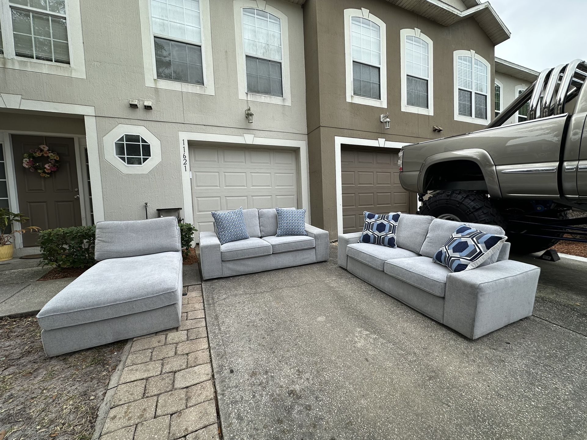 Clean 3-piece modern sofa set in excellent overall condition from a pet-free, smoke-free home. ✔️ No rips or tears ✔️ No sagging cushions ✔️ Structurally solid ✔️ Well cared for 🔹 Small, light stains from normal use — minor and can be spot-cleaned. We are happy to clean before pickup or delivery. Includes: • 2 sofas • 1 chaise lounge • Accent pillows included Neutral gray color fits most spaces. Comfortable, supportive, and ready to use. 🚚 Delivery available (fee based on distance) 💬 Message if interested — priced to sell and available now.
