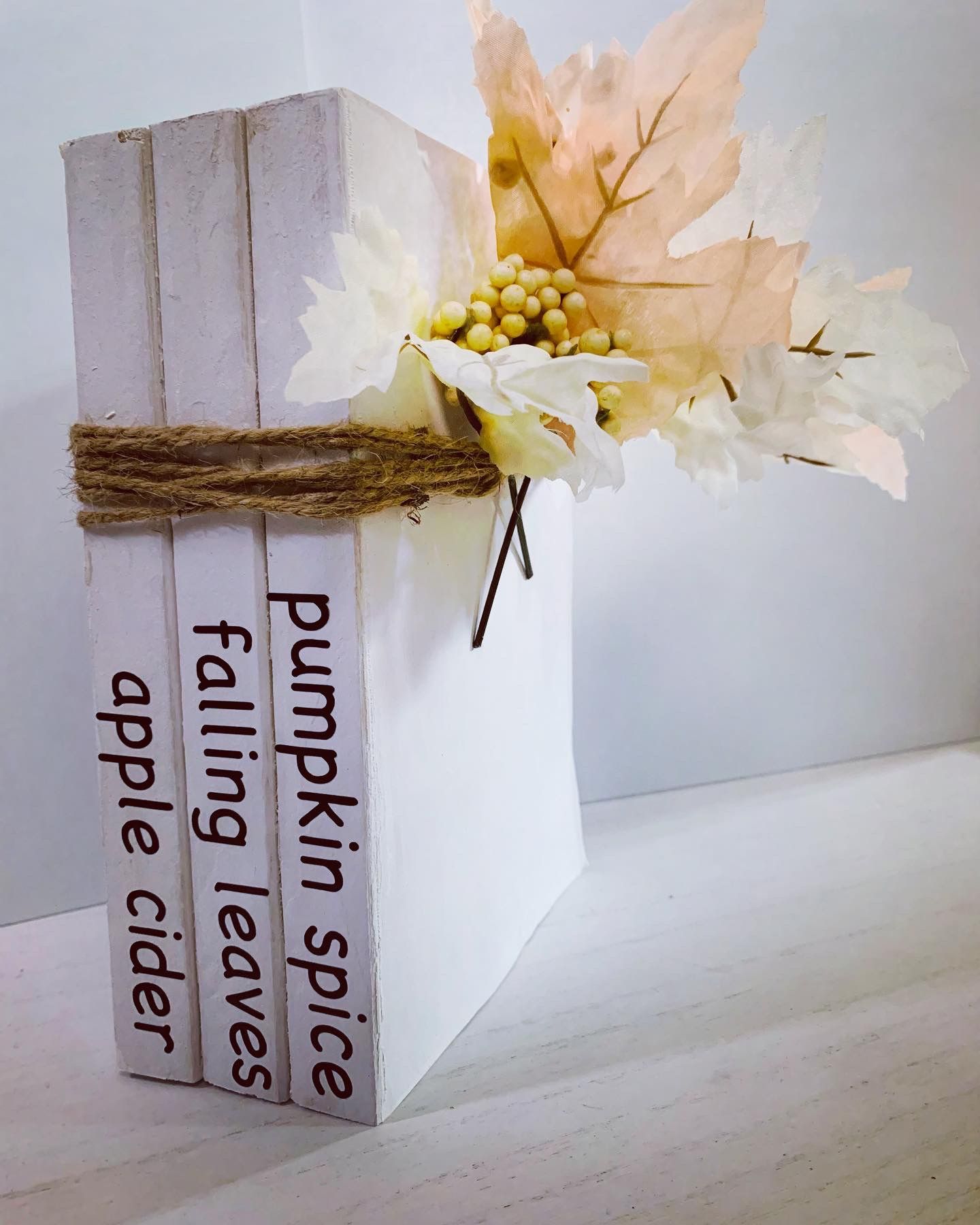 New Book stack made for any season or whatever saying you want on it. Three book stack at $12 and a $1 for any added book.