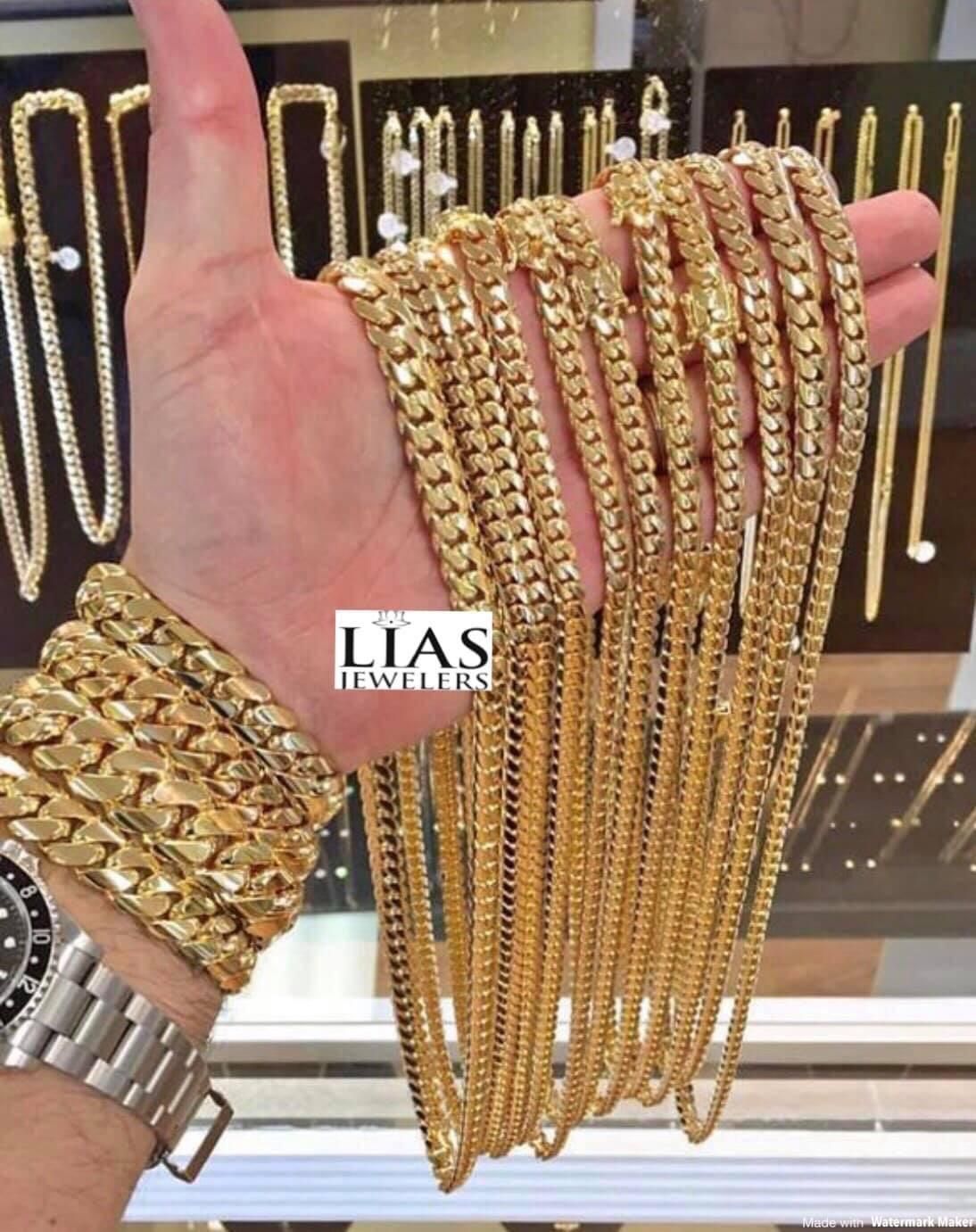 Brand new 18 k yellow gold filled Cuban link chain and bracelet Available in most sizes! Also have men’s jewelry Cuban link set men’s necklace chain bracelet Miami Cuban link tennis link set Figaro chain set