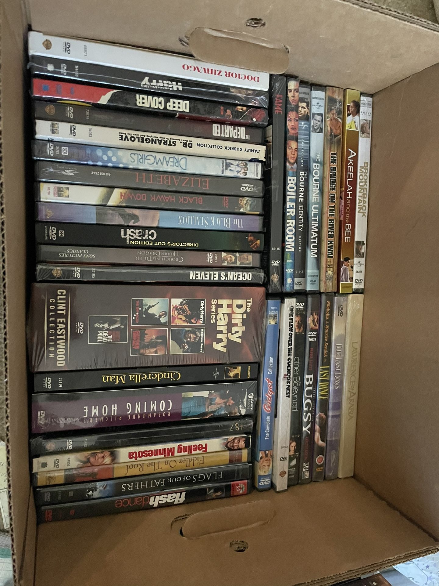 Whole box of Dvd and blu ray. Most are new. $10 for the box.