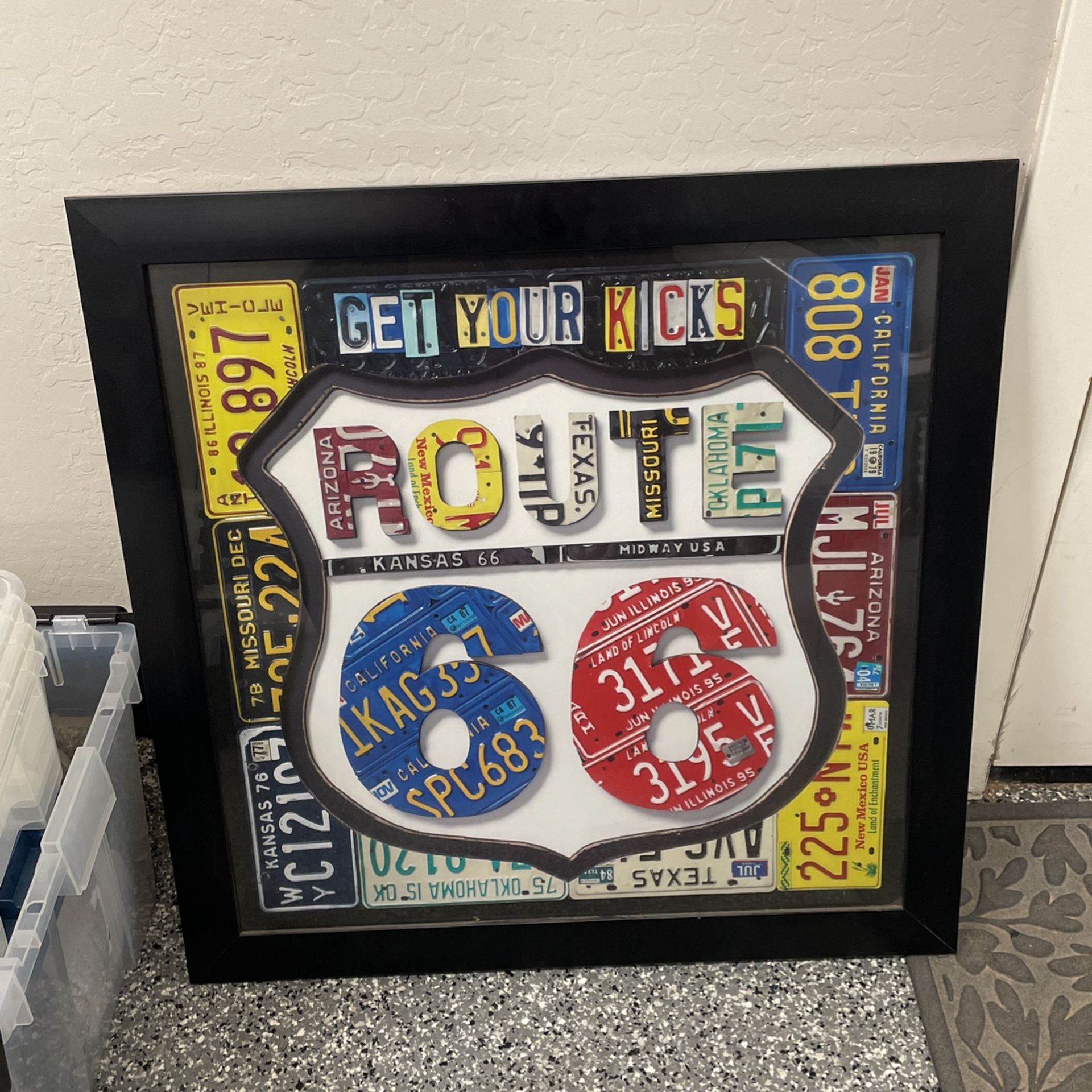 A Route 66 pictured framed of phones of Route 66 state license plates. Aprox 27”X27”. Cost $80 new 10 years ago.