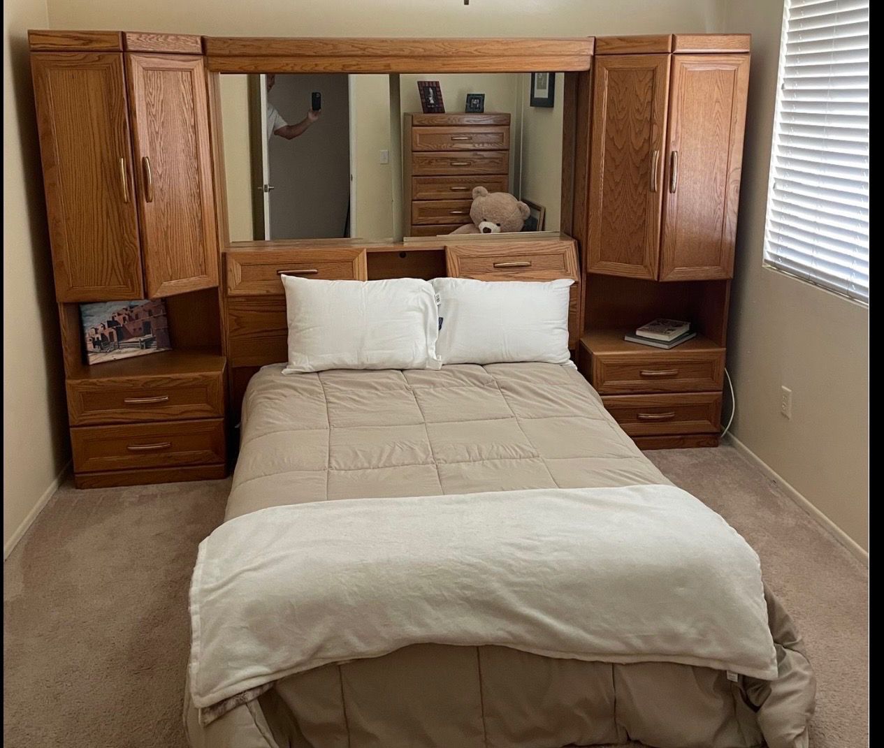 Large queen-size headboard wall unit with built-in storage. Features include upper cabinets, drawers, open shelving, and a large center mirror (small corner broken). This is a full wall-style headboard system, not a standard standalone headboard. Wood construction with an oak-style veneer finish. Very sturdy and heavy. All drawers and cabinet doors function properly. Perfect for maximizing storage in a bedroom—great for apartments or rooms with limited closet space. Bed frame/mattress not included. Pickup only. Bring help—this is a large, heavy piece. $300 obo