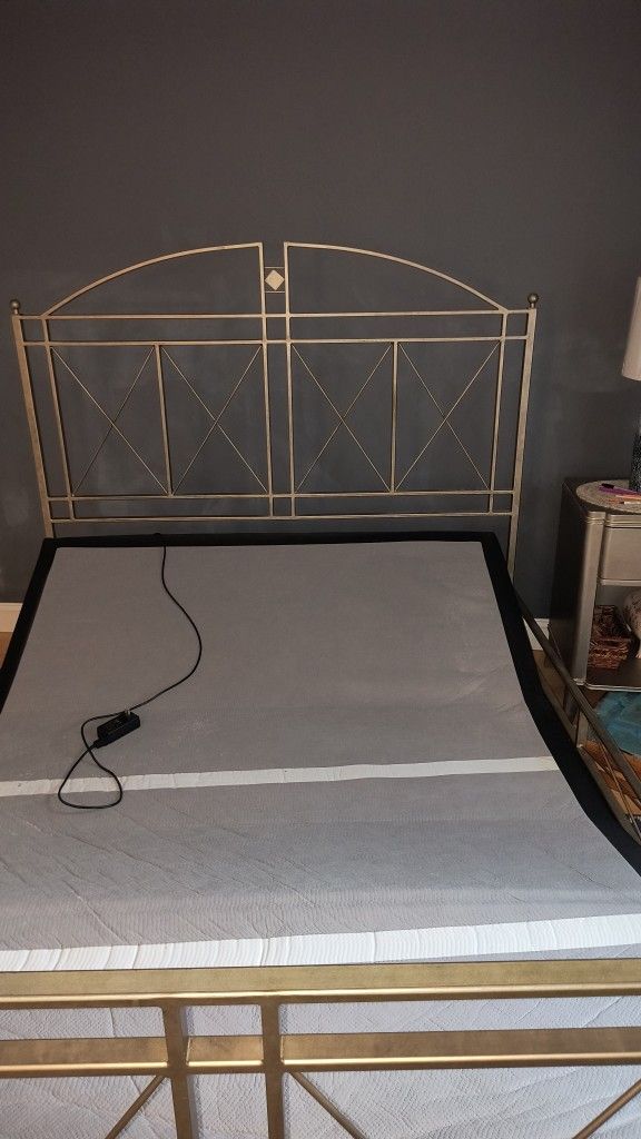 Iron queen size frame like new. Goes with everything. It has a electric pad underneath it works with the frame we can talk about it sold separately or together it depends on what you want. I wouldn't see iron bed frame but moving. I have all screws and parts