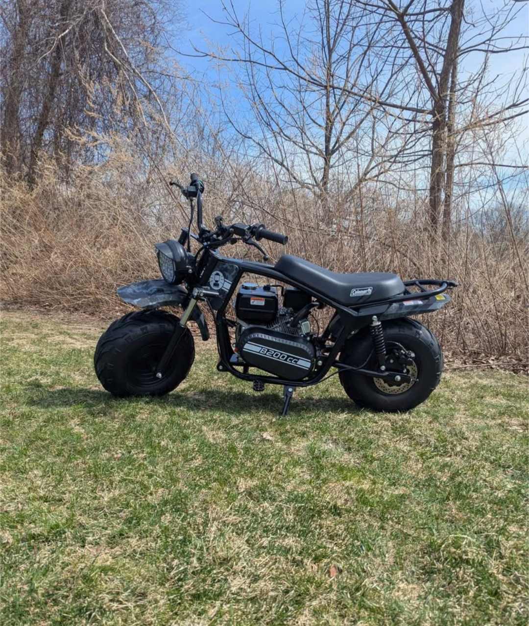 Coleman B200RSV rear suspension mini bike, 6 HP, Black, 37 MPH, Custom exhaust, two added LED front lamps and rear tail lamp, plus phone holder, all included. The primary headlight runs off of the engine so when not accelerating, the light dims, hence the additional LEDs. Have original exhaust as well. The big difference between this and other cheaper mini bikes, is the rear suspension, and it has front and rear disc brakes. Very little use, by an adult, not a child, not beat on! Looks and runs like new. Over $150 in the added accessories. New lists for $999+ tax, so this is a good deal! Please do not ask if it's available, I will not respond to that question. If it's listed, it is available.