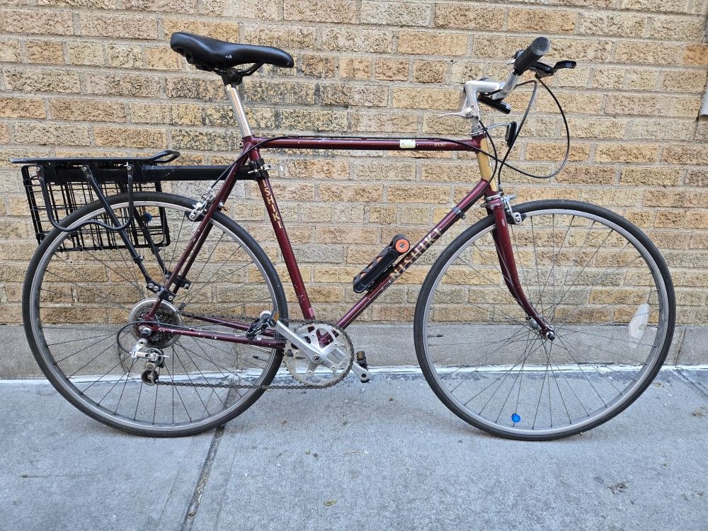 Vintage Nishiki Sport road bike with some upgraded components, including the saddle, handlebars, brake pads, brake levers, cassette, and chain ring. Steel frame. Exact size unknown, but has worked fine for 6'1 rider. Rear rack included Pictured but NOT included: * Rear basket * Lights * Lock and lock mount