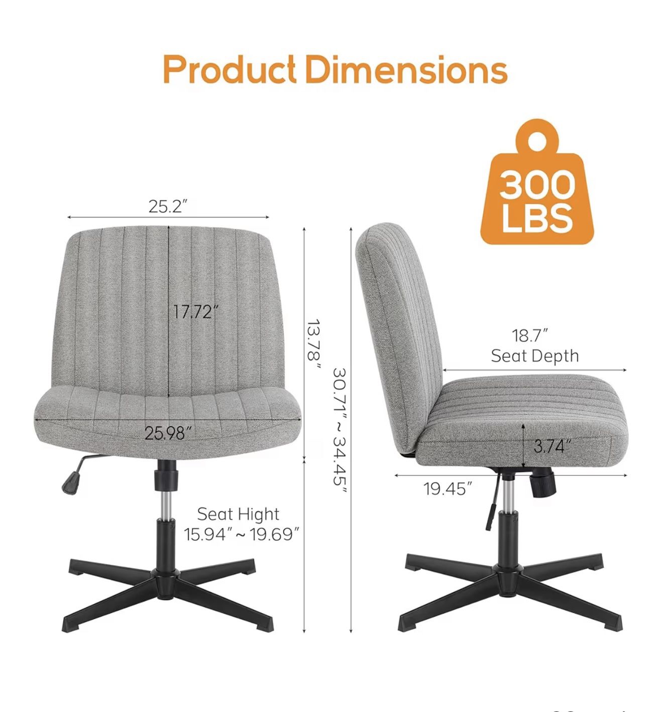 Selling a modern, minimalist desk chair in great condition. Upholstered in soft gray fabric with a clean, streamlined design that looks great in any home office, bedroom, or study space. Comfortable for daily use and easy to adjust. Features & Details: • Adjustable seat height: 15.9”–19.7” • Overall height: 30.7”–34.5” • Seat width: ~26” • Seat depth: 18.7” • Padded seat and backrest for comfort • Smooth swivel base • Sturdy construction, supports up to 300 lbs • Neutral gray color that matches most décor No rips, stains, or mechanical issues. From a smoke-free home.
