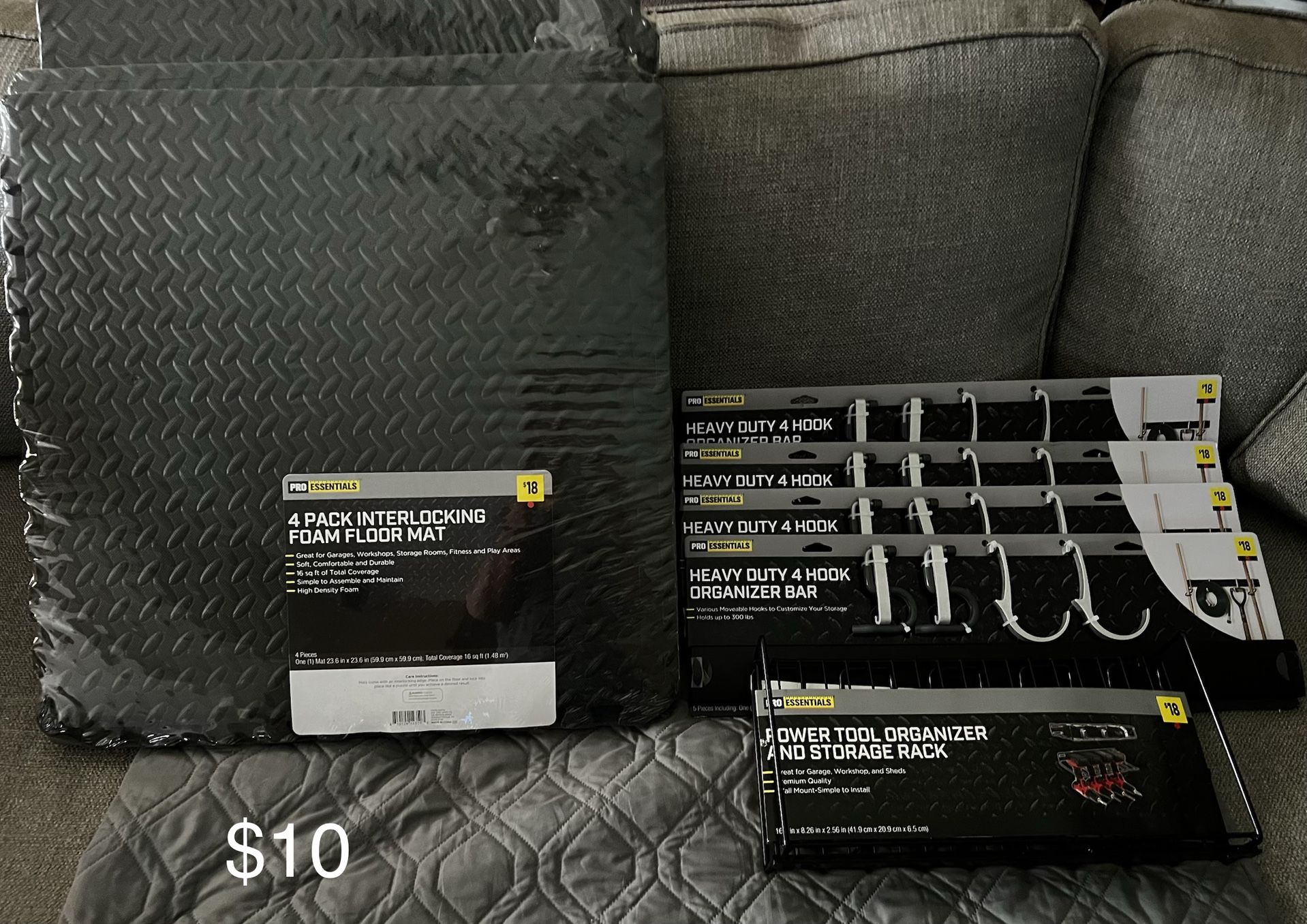 Garage organizer hooks, bungee cords, foam knee pads, and foam floor mats (for working on cars) PRICE IS ON THE PICTURE, EACH