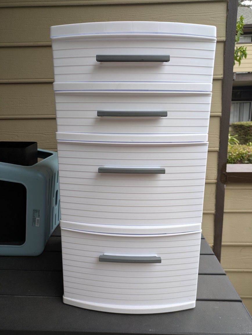 Medium size 4 drawer tower from Brightroom (Target brand). Two small and two large drawers with pull handles. Dimensions are 24 inches high by 12.62 inches wide. Drawers are 15 inches deep. Unused and has been stored on our balcony. Local pick up. Thank you for looking!