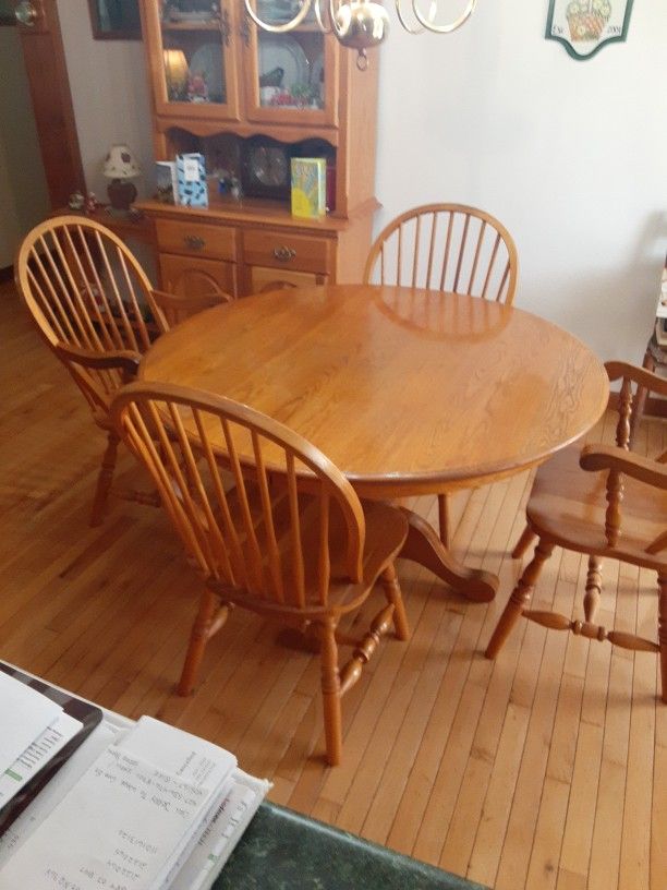 48in round pedestal natural oak table with 18in leaf. 2 arm chairs and 2 side chairs. China base is 38in long 18in wide and 32in high. China hutch is 35in long 13in wide and 44in high and 2 glass front doors.