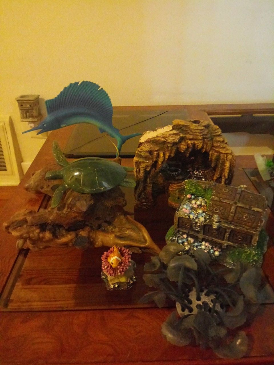 Must go today..if no sale donated. Fish tank decor and supplies filter, heat lamp, 2 oxygen, 5 piece Treasure theme decor set and Greenery/shrubs. Great condition all u need is the fish and a tank. Must go today