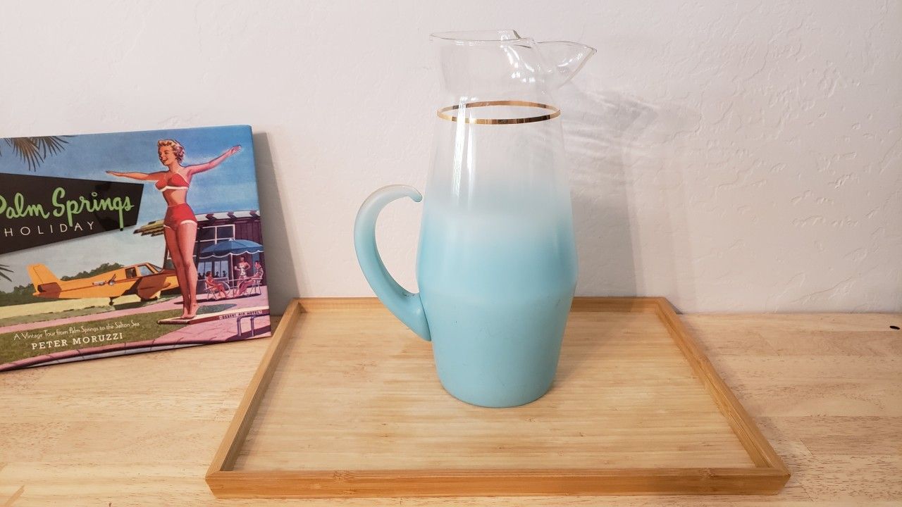 Dimensions - 11.5" tall, 7.5" across at handle, 4 1/8" across the top at lip, 3.75" across the base. Material Glass Dimensions Pitcher capacity: 80 Fluid ounces Description This is a gorgeous glass pitcher from West Virginia Glass Company in their Blendo Turquoise line, circa 1955. It is a lovely midcentury piece with the turquoise (aqua) frosted lower portion and clearer top with a gold band. The shape is quintessential MCM with the partially unattached handle and decorative ice lip. It has minor scratches to the gold and some scratches to the sides, no chips or cracks and no major stains. It is 11.5" tall, 7.5" across at handle, 4 1/8" across the top at lip, 3.75" across the base.