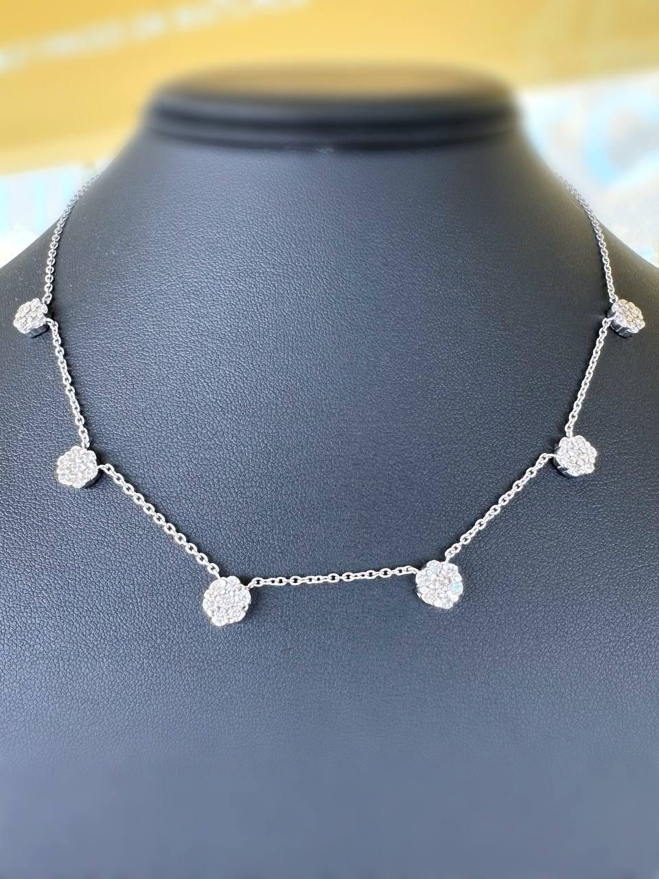This gorgeous necklace is made of 14k solid white gold with Natural diamonds round shape. Total weight of stones is approximately 2.7 carats, Vs-Si mixed, G-H color. Necklace size: 16 inches length and 1.6mm width. Total weight: 8.5 grams. Condition is like new! Made in Italy. The unique design resembles blossoming flowers that can highlight your natural beauty, making your image irresistible! The best choice for you. Perfect gift! β€οΈππ We buy Rolex and Audemars, patek . Do layaway in vipawn Boca Raton π₯ππΈ