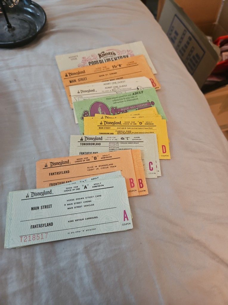 50 Disneyland tickets 1-key, 2 adult admission, 3- B junior admission & 43 A,B,Cand D tickets Plus 1- Knotts berryfarm admission Ebay is as king more than $500 $200 OBO Great gift for Disneyland lover