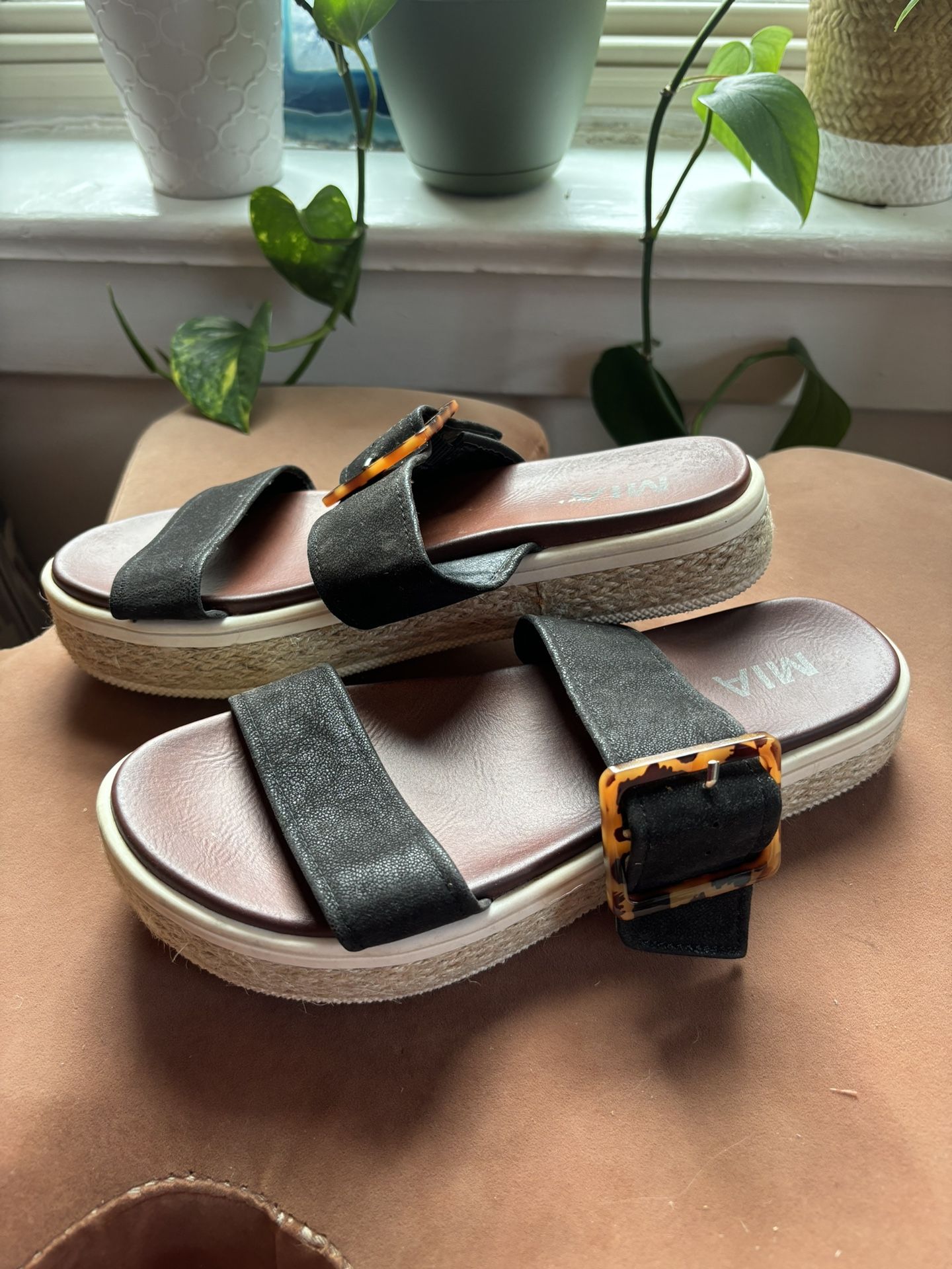Mia 7.5M Carleen Slip On Espirella Sandal Low Platform Tortise Buckle Black Straps