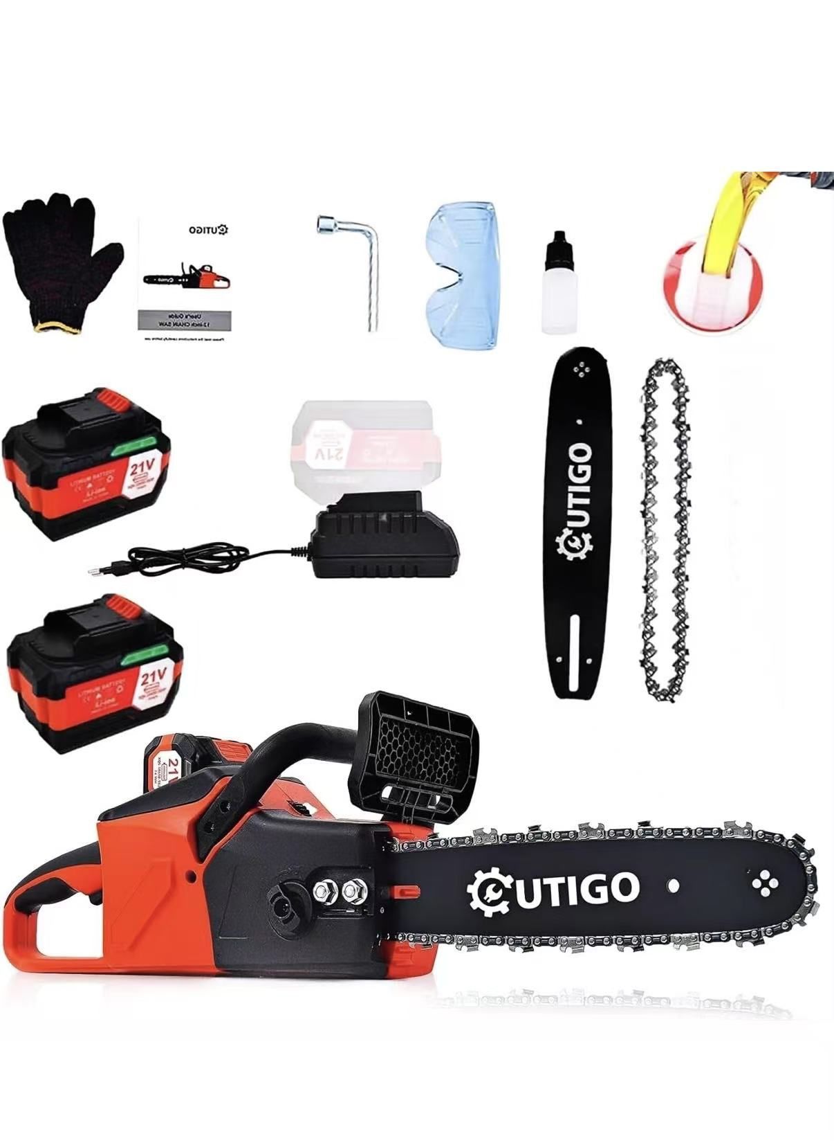 【Brushless Motor for Efficient Cutting】This OUTIGO 12 inch cordless chainsaw features an efficient brushless motor. It uses advanced chip technology and high-quality gear design to ensure smooth and efficient cutting. Can quickly cut branches up to 12 inches in diameter and complete the task in about 7 seconds. 【2×21V large capticty battery】This chainsaw is equipped with 2 rechargeable 21V 4000mAh batteries. This chainsaw can provide long-lasting and stable power output, and you can switch to the backup battery when the power is exhausted. Get rid of the cord shackles. Its dual anti-leakage technology and surface balling treatment increase its durability and service life. Ideal for wood harvesting, orchard pruning and bamboo cutting. 【Multiple Safety Protection】1. The safety lock prevents the electric saw from starting accidentally, and the safety button and switch must be pressed at the same time to start. 2. The safety shield prevents sawdust from flying around. 3. A pair of gloves ensures comfort and safety when operating the device. Safety; 4. A pair of safety glasses protects your eyes from sawdust. 5. The additional non-slip front handle helps you hold the chainsaw firmly. 【Efficient Chainsaw】: OUTIGO chainsaw adopts integrated guide bar, ultra-high hardness chain to ensure smooth cutting. The speed is 42000 rpm. High wear resistance, long life and stable operation. Improve the efficiency of pruning and yard maintenance work. 【Package List】: 1 cordless chainsaw, 2×21V high-capacity batteries, 2 chains + 1 guide bars (one pair already installed on the saw), 1 CE fast charger, 1 wrench, 1 pair of gloves, 1 pair of goggles, 1 bottle of oil, 1 instruction manual. OUTIGO chainsaw is a perfect gift for father, mother, parents, friends, husband, DIY enthusiasts, gardening enthusiasts and woodworkers. If you are not satisfied with the OUTIGO chainsaw or have any other questions, please contact us.
