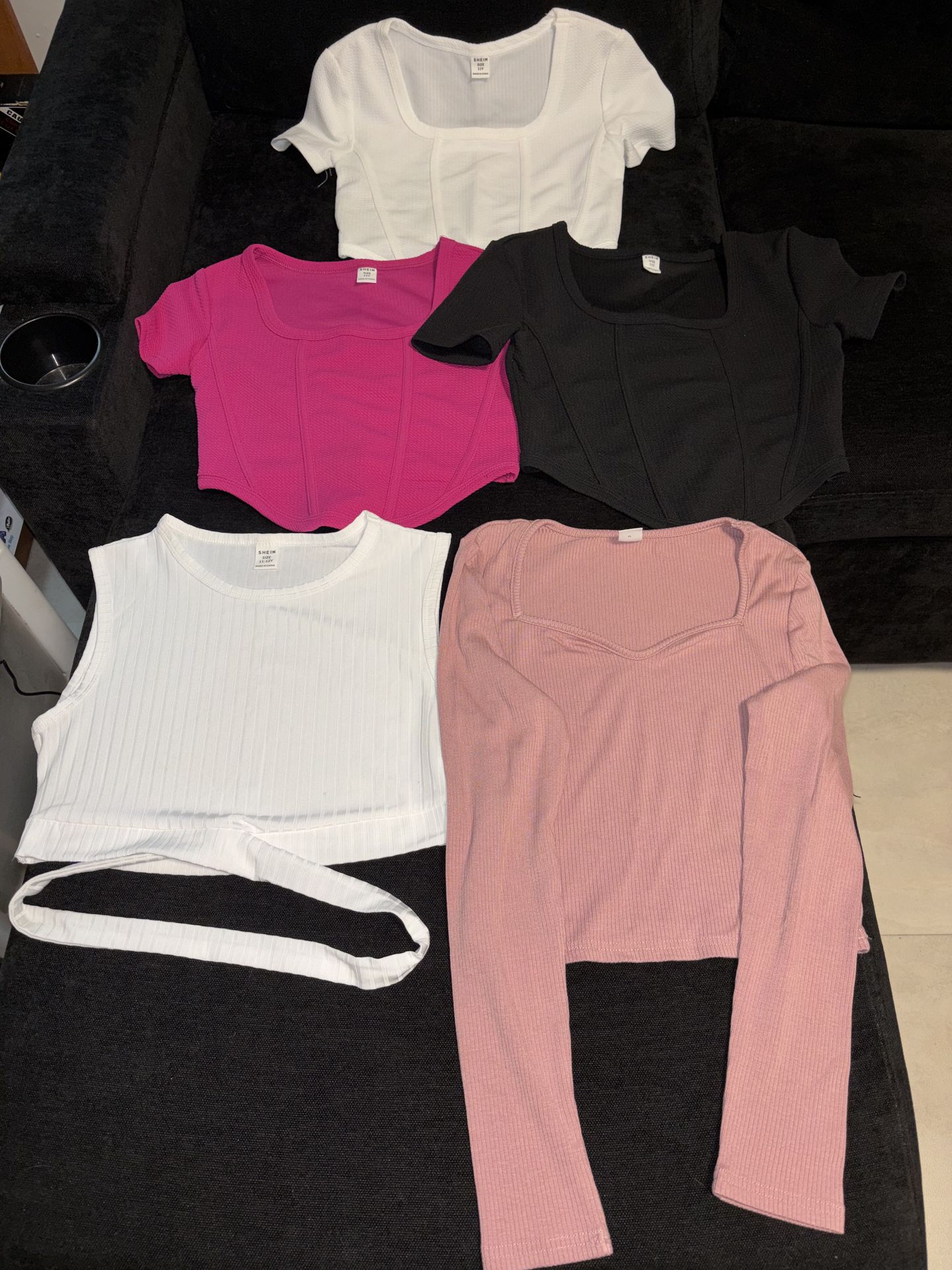 Includes a white sleeveless tie-front crop top, a white square-neck puff-sleeve top, a hot pink square-neck top, a black square-neck top, and a pink long-sleeve square-neck top. All tops are size 12-13Y.