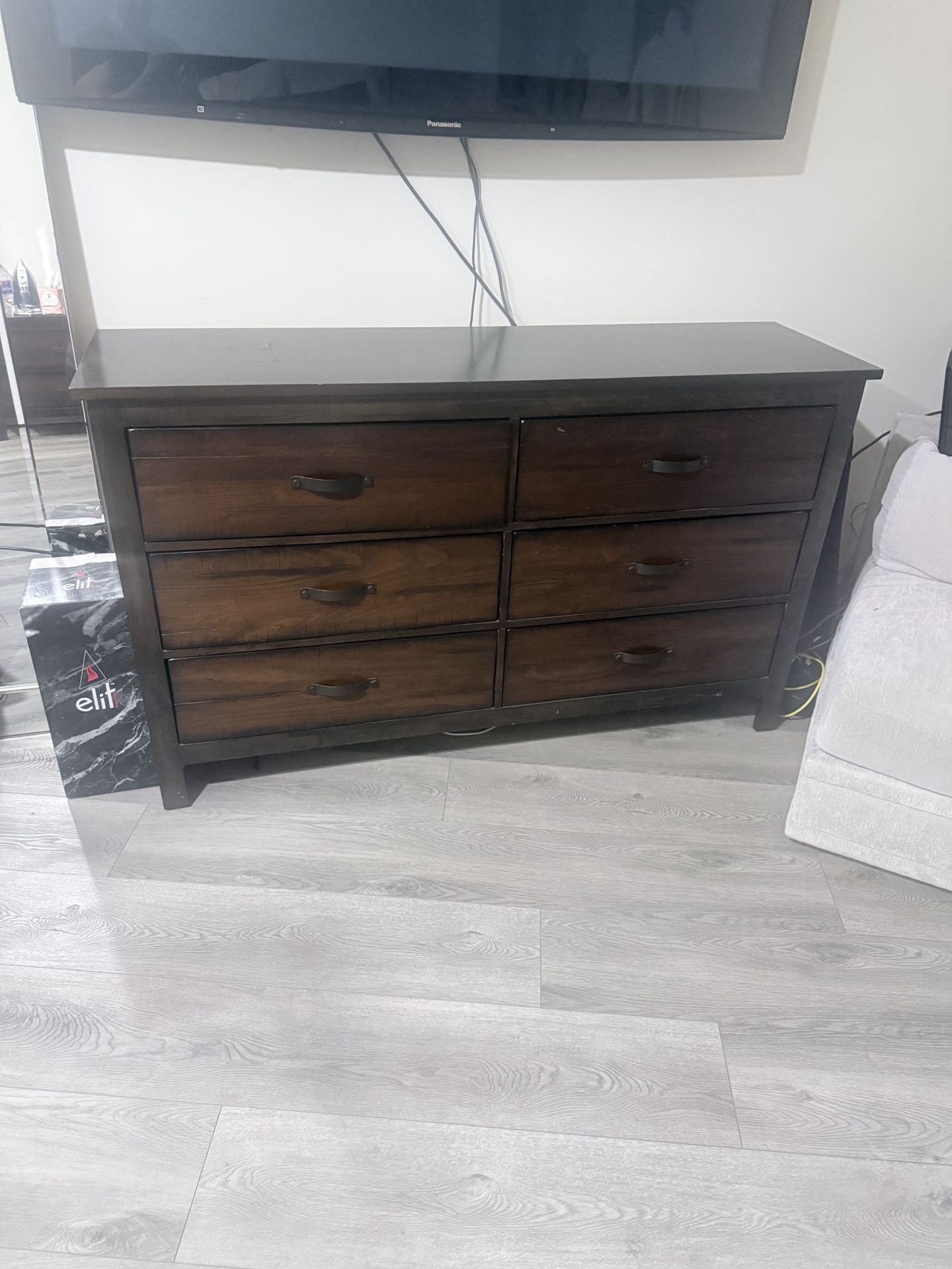 Beautiful dark wood Cal King bedroom set including: • California King bed frame (headboard and platform base) • 6-drawer dresser • Tall chest of drawers • Two matching nightstands Excellent overall condition. Minor cosmetic wear includes fine surface scratches on one nightstand and one cabinet drawer that needs minor repair. Mattress and box spring NOT included. : Margo