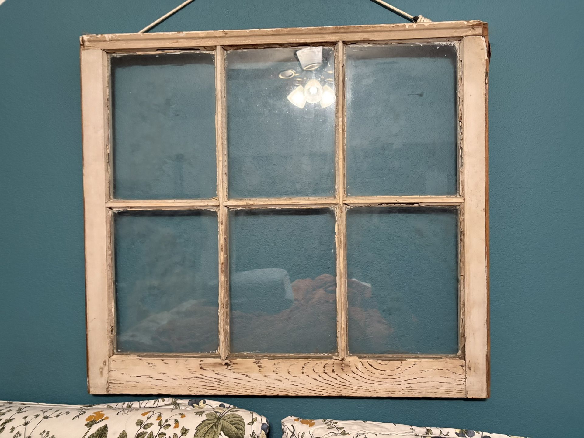 30” x 30” Charming reclaimed-style window frame used as decorative wall art. Lightly distressed wood with original glass panes creates a timeless farmhouse look. Hung easily with rope