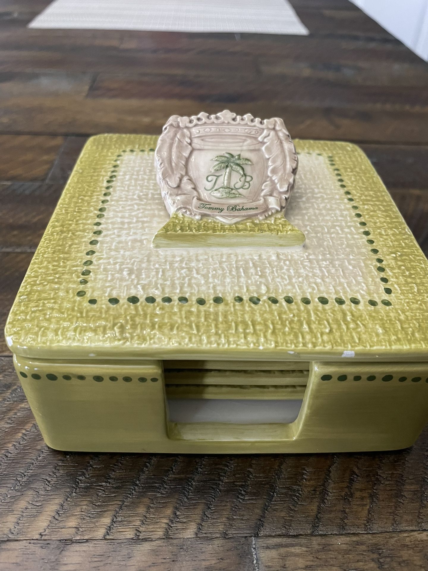 - Tommy Bahama set of 5 ceramic coasters that come stacked inside a ceramic holder with a lid - Palm tree and seahorse design